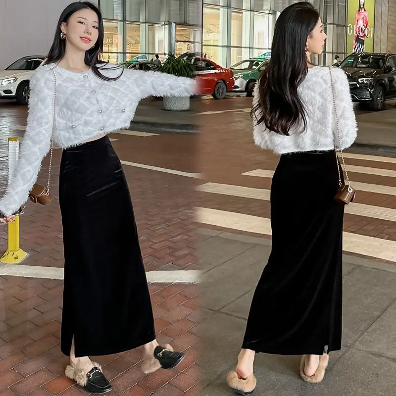 Długie spódnice z aksamitu w kolorze czarnym, damskie, jesienno-zimowe, z wysokim stanem, faldas, koreańska moda, odzież, spódnice midi typu bodycon dla kobiet pracujących w biurze, TT493