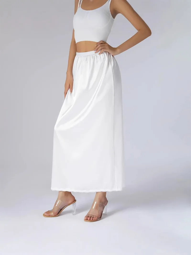 Miękka satynowa spódnica z koronkowym wykończeniem, wysoki stan, plisowana, linia A, satynowa podszewka, antystatyczna, elegancka, szykowna mini spódniczka.