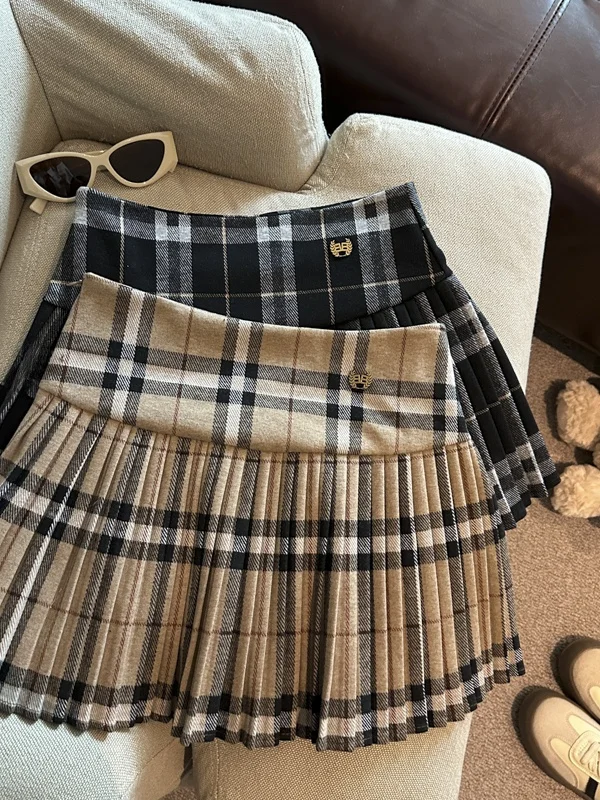 Koreańska spódnica w kratę z wełny, z wysokim stanem, o kroju litery A, spódnica ort, spódnica damska, moda wyszczuplająca, styl uniwersytecki, elegancka, jesienna...