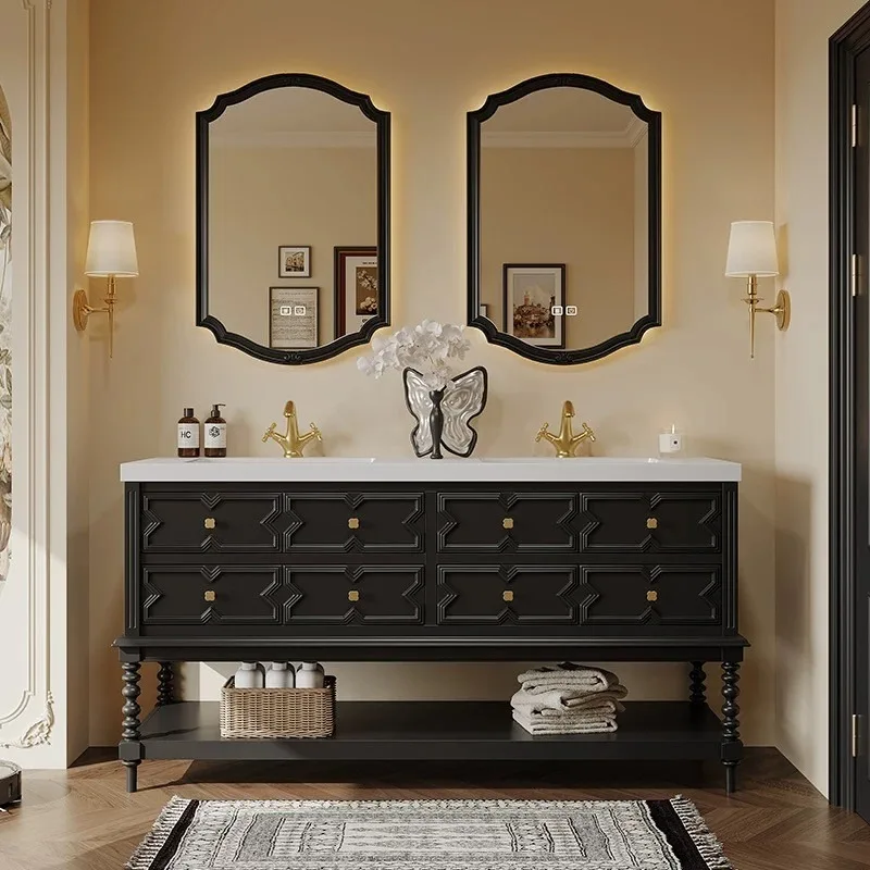 Kombinacja szafki łazienkowej w stylu francuskim, ceramiczna umywalka zintegrowana z blatem z płyty kamiennej, umywalka toaletowa, kolor kremowy, styl wiatr.