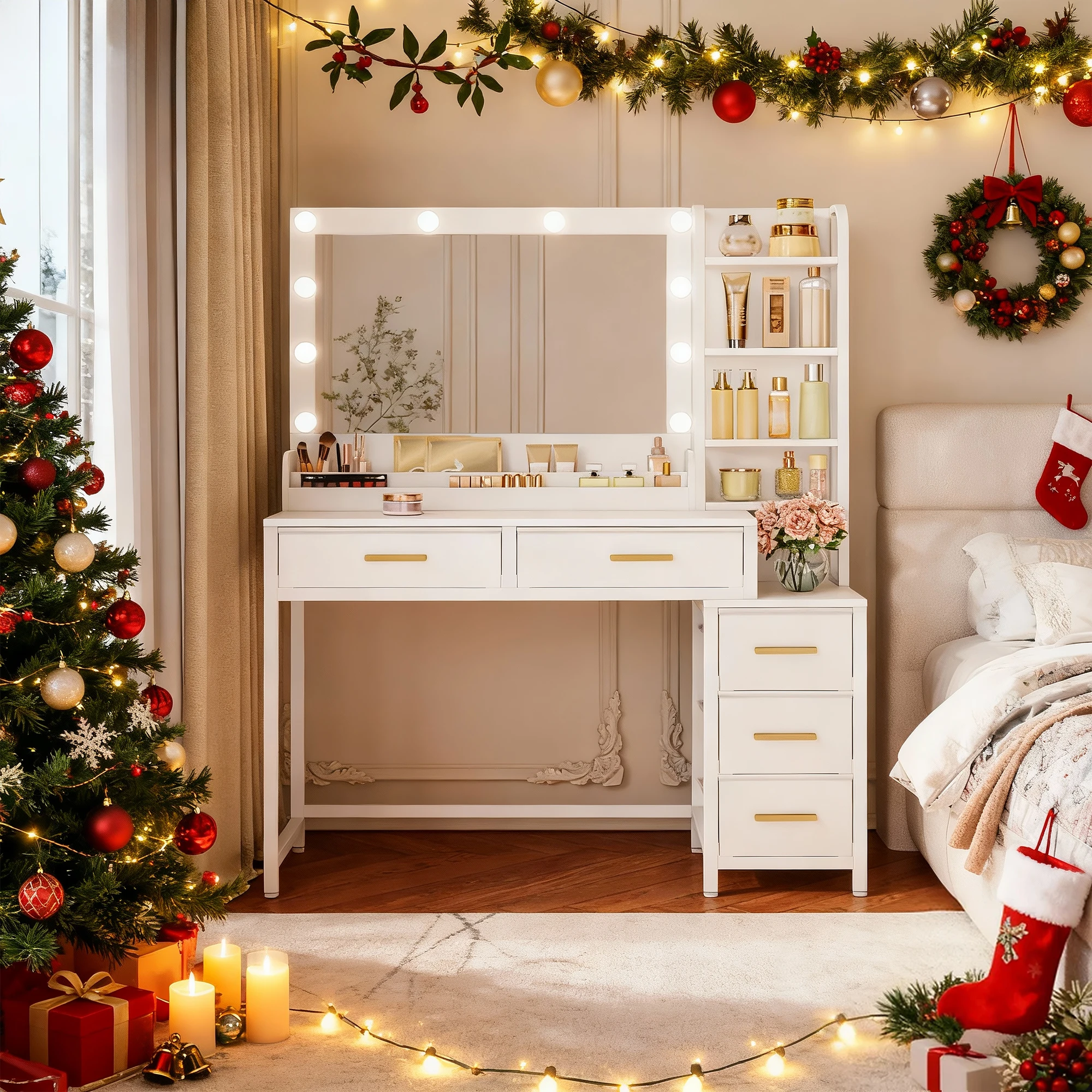 Toaletka z dużym lustrem, z 5 szufladami, 5 otwartymi przegródkami, przestrzenią do przechowywania przed lustrem, nowoczesna.