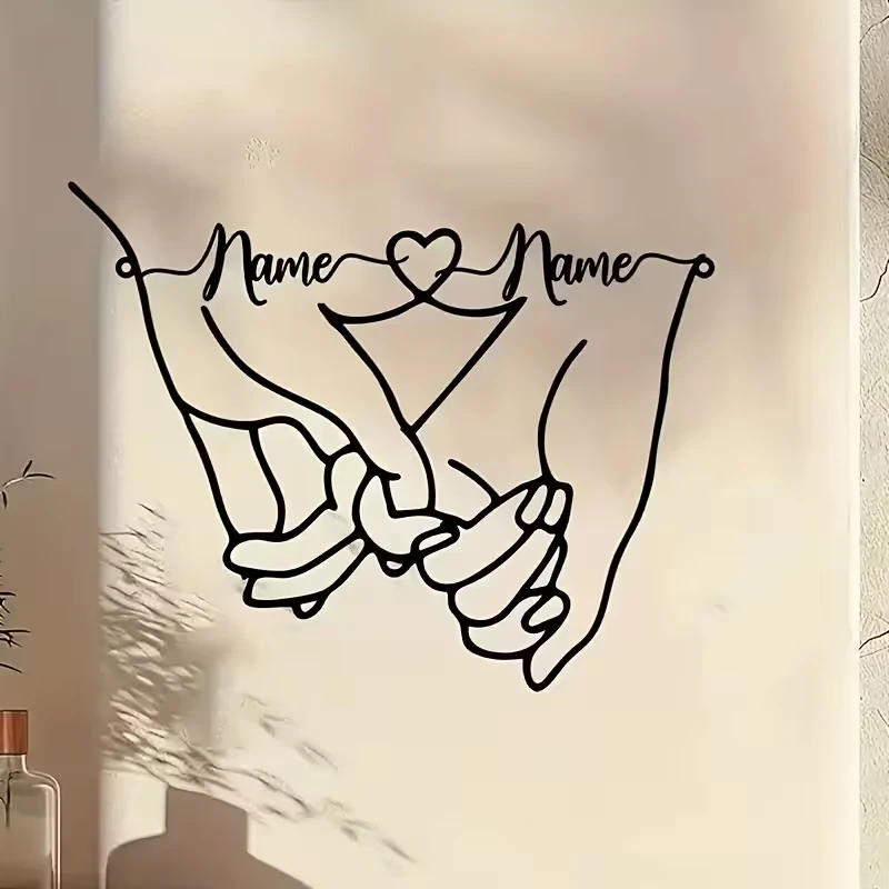 Metalowa rzeźba ścienna na zamówienie, personalizowane imię i wzór w kształcie serca - motyw miłości w trakcie ręki trzymanych, do montażu na ścianie w sypialni, ślub.