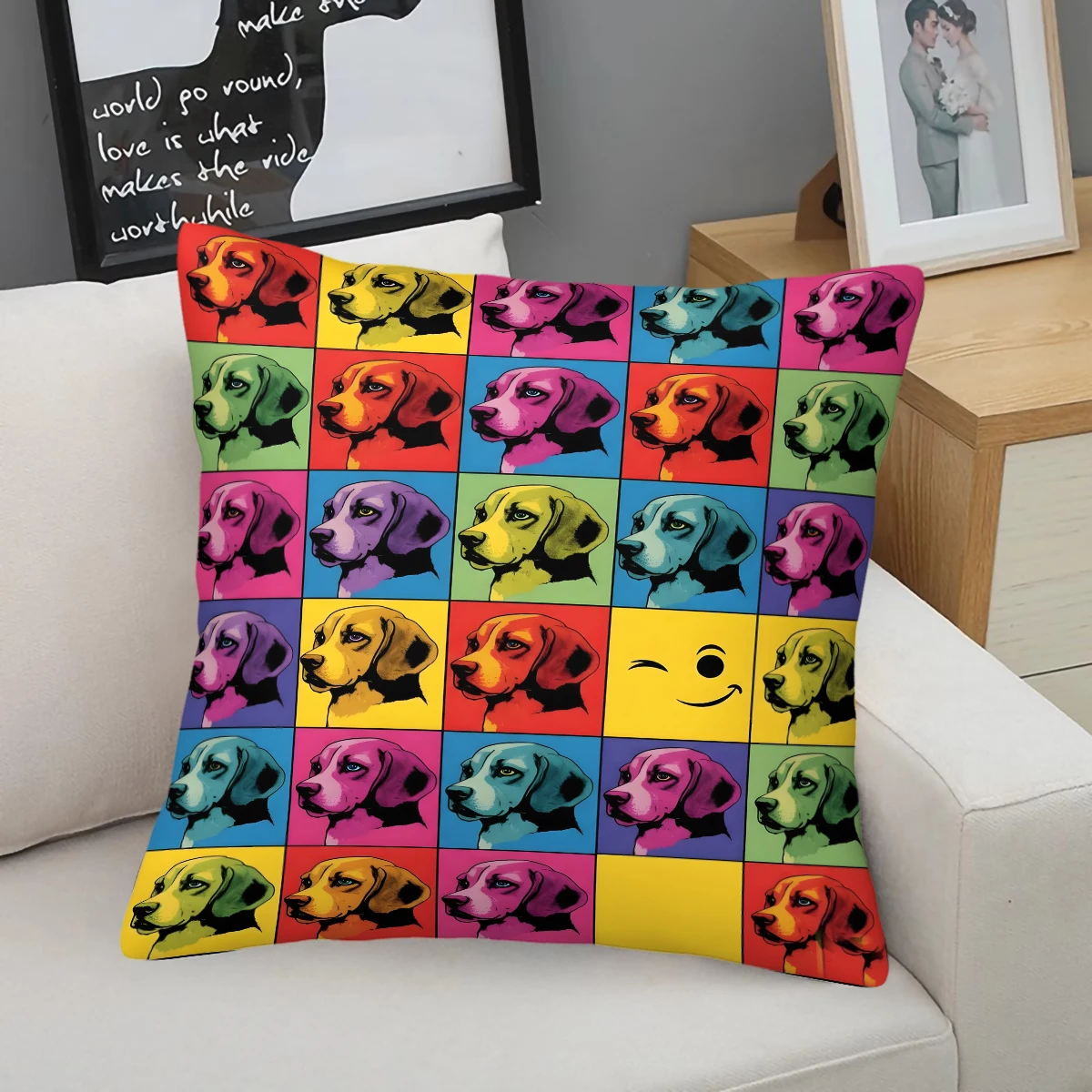 Poduszka z nadrukiem jamnika w stylu pop art: Żywy, kolorowy wystrój z zabawnymi szczeniakami, dodający radosnego nastrzępu do przytulnych przestrzeni i na sofę.
