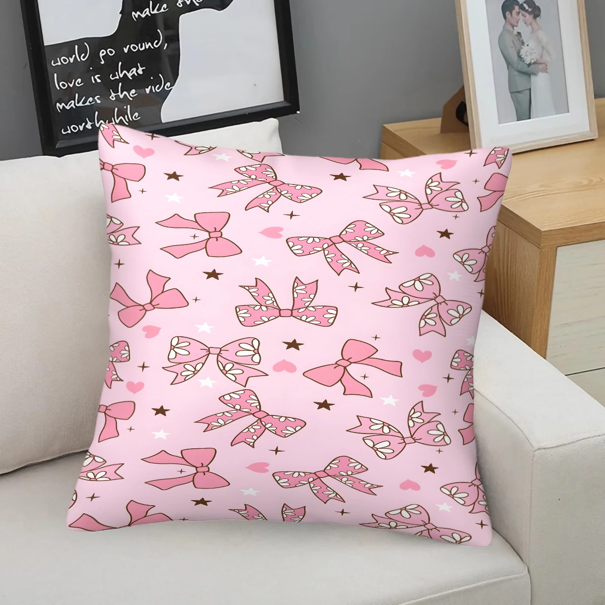 Poduszka z kwiatowym motywem w stylu akwareli, kokardą i serduszkiem: Idealna do pokoi dziewczęcych i przytulnych narożników do czytania, dodająca miękkiego, uroczego blasku i miłości do jasnych przestrzeni.