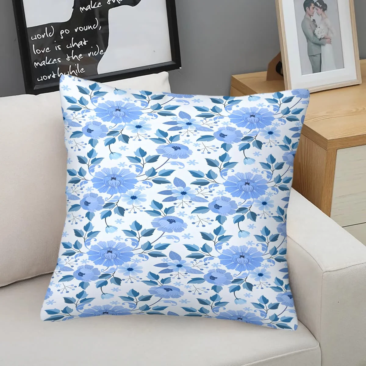 Poduszka w kolorze turkusowym z motywem kwiatowym: Świeży botaniczny wystrój, idealna do przytulnych salonów, dodająca spokoju i naturalnych nawiązowań do przestrzeni domowych.