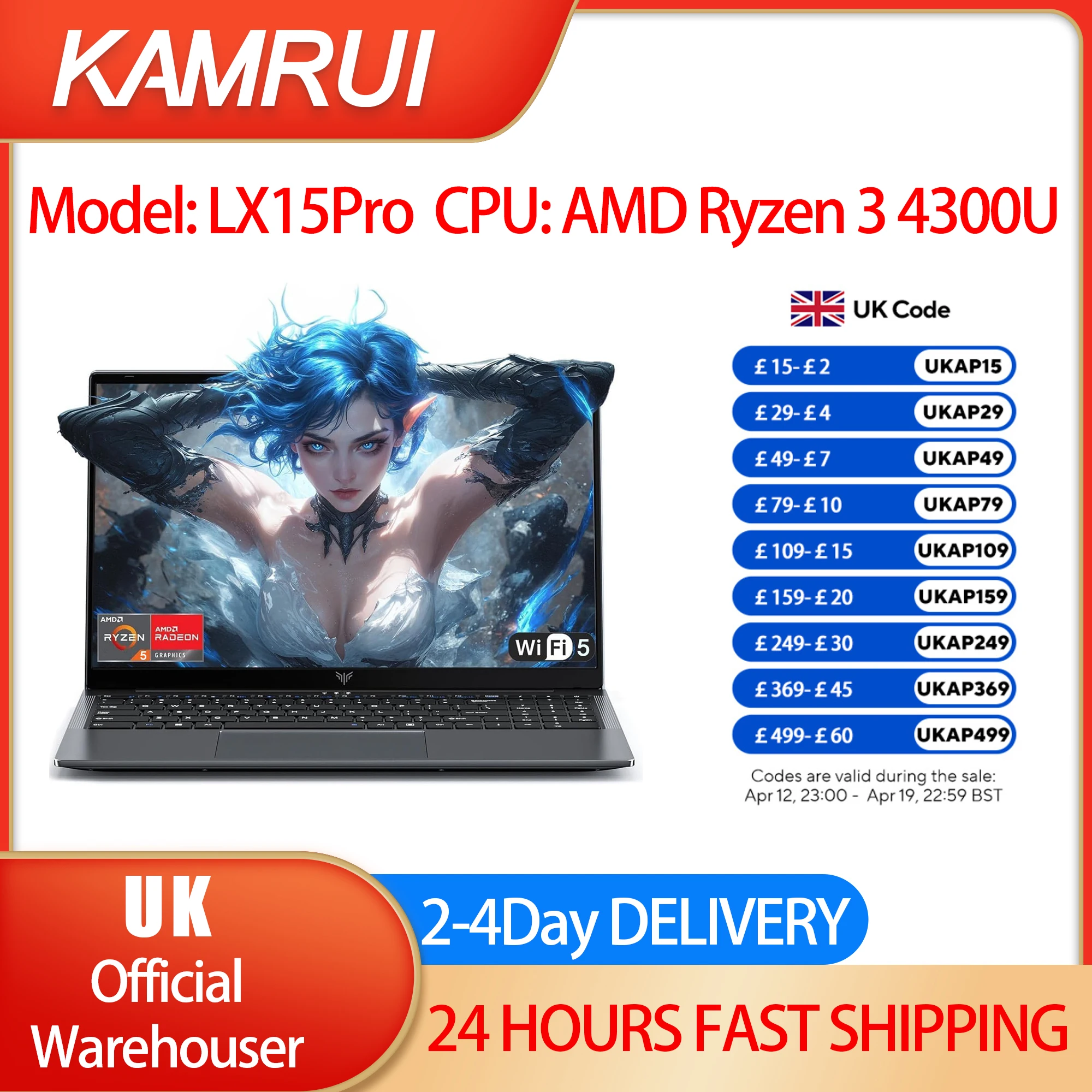 KAMRUI 15.6 Laptop do gier AMD Ryzen3 4300U Laptop z systemem Windows IPS 16GB DDR5 512GB NVMe SSD Podświetlana klawiatura i klawiatura numeryczna Wifi5