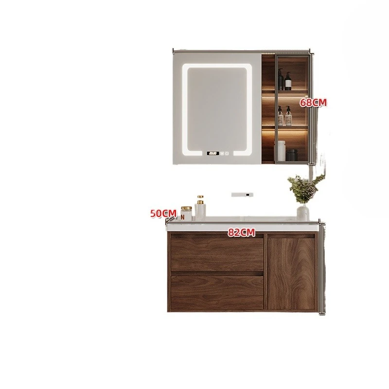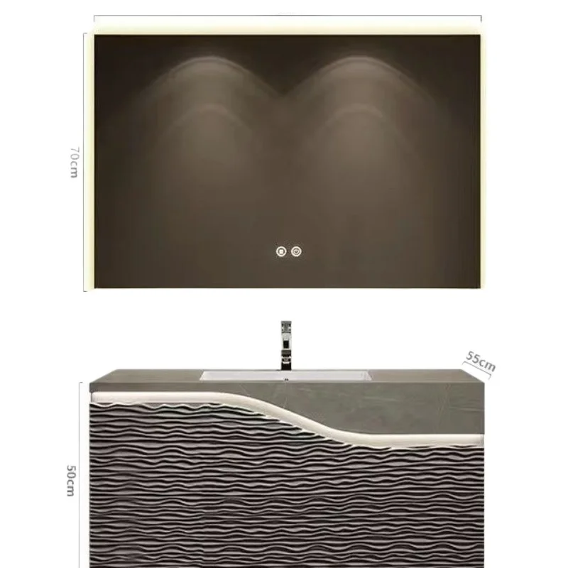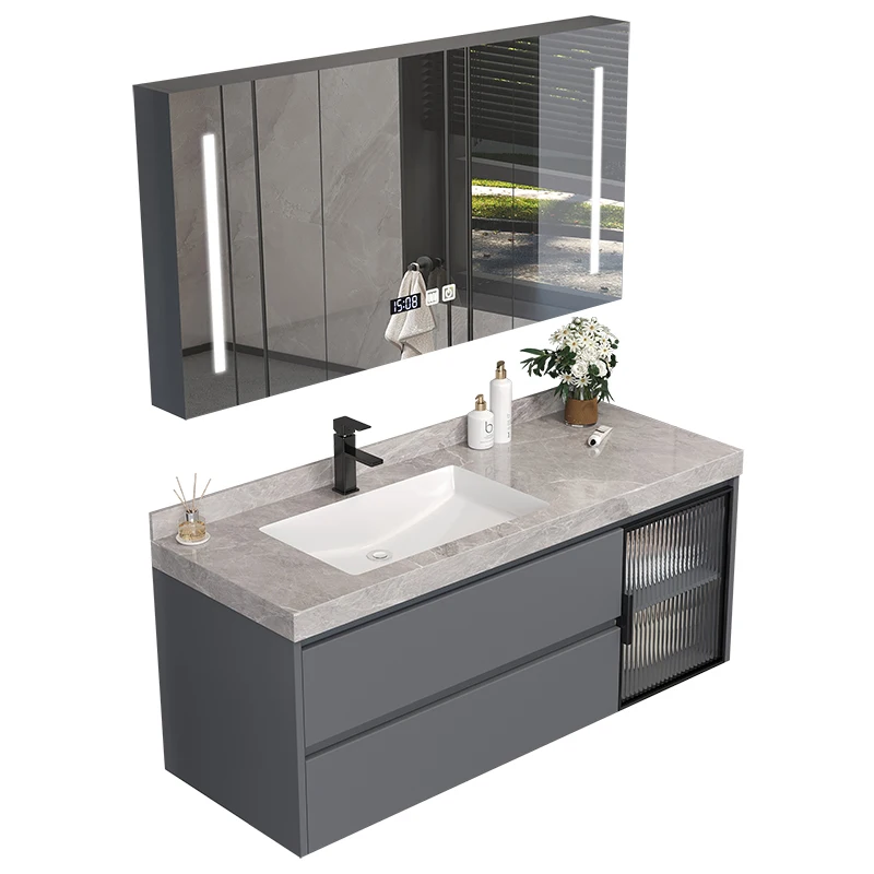 Nowoczesny wiszący zestaw mebli łazienkowych z jednoczęściową ceramiczną umywalką, szafką z lustrem i baterią, zapewniający dużą przestrzeń do przechowywania.