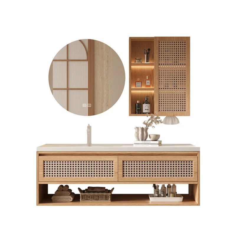 Zestaw mebli łazienkowych w stylu Wabi Sabi: szafka z drewna w kolorze naturalnym, rattan japoński, dąb czerwony, zintegrowana umywalka ceramiczna i toaleta.