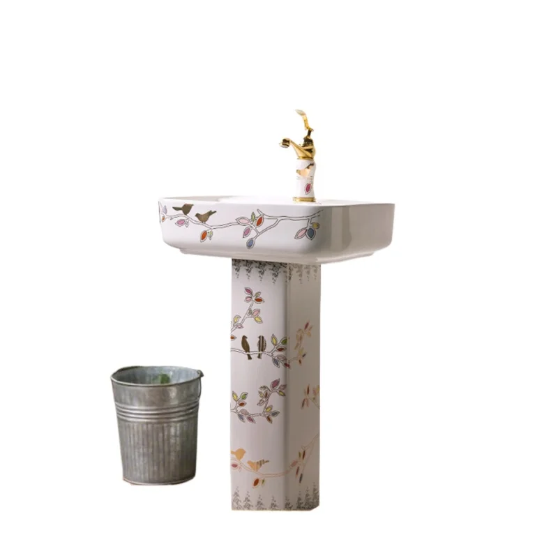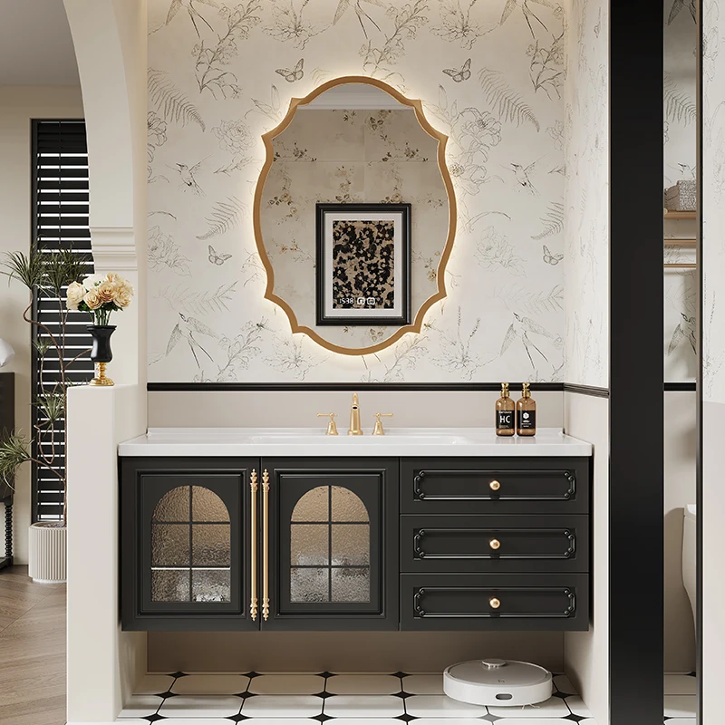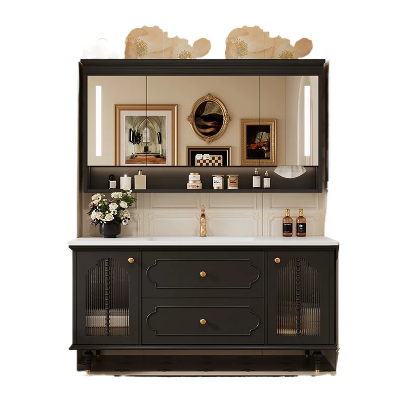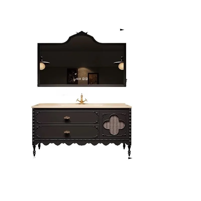 Francuska szafka łazienkowa w stylu vintage, zestaw podłogowo-sufitowy z zintegrowaną umywalką, dębowa umywalka, umywalka do mycia rąk i twarzy, możliwość personalizacji.