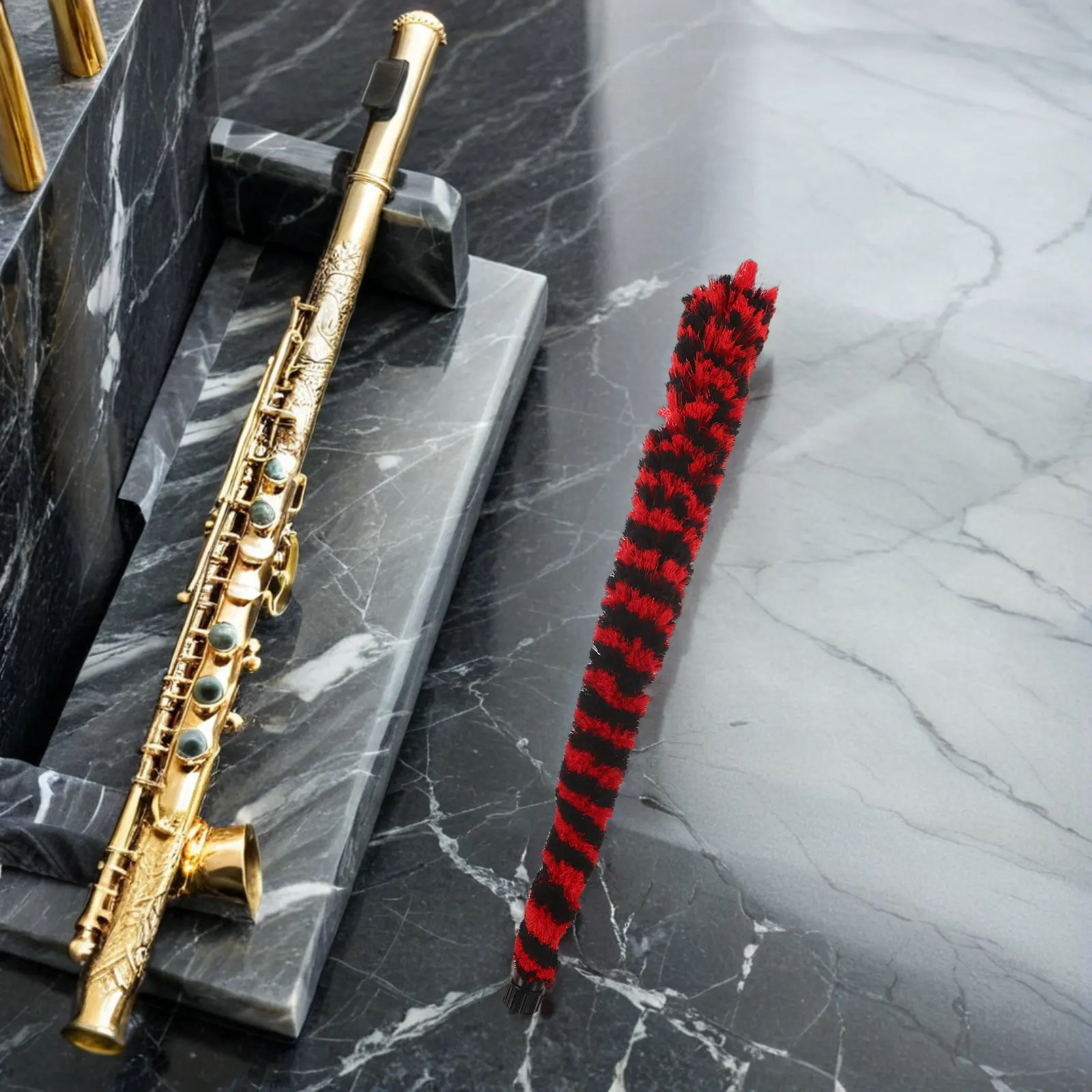 Szczotka do czyszczenia saksofonu altowego z czarno-czerwonym wzorem, wacik do czyszczenia szyjki do skutecznego usuwania zanieczyszczeń z instrumentu, pielęgnacja instrumentów dętych drewnianych.