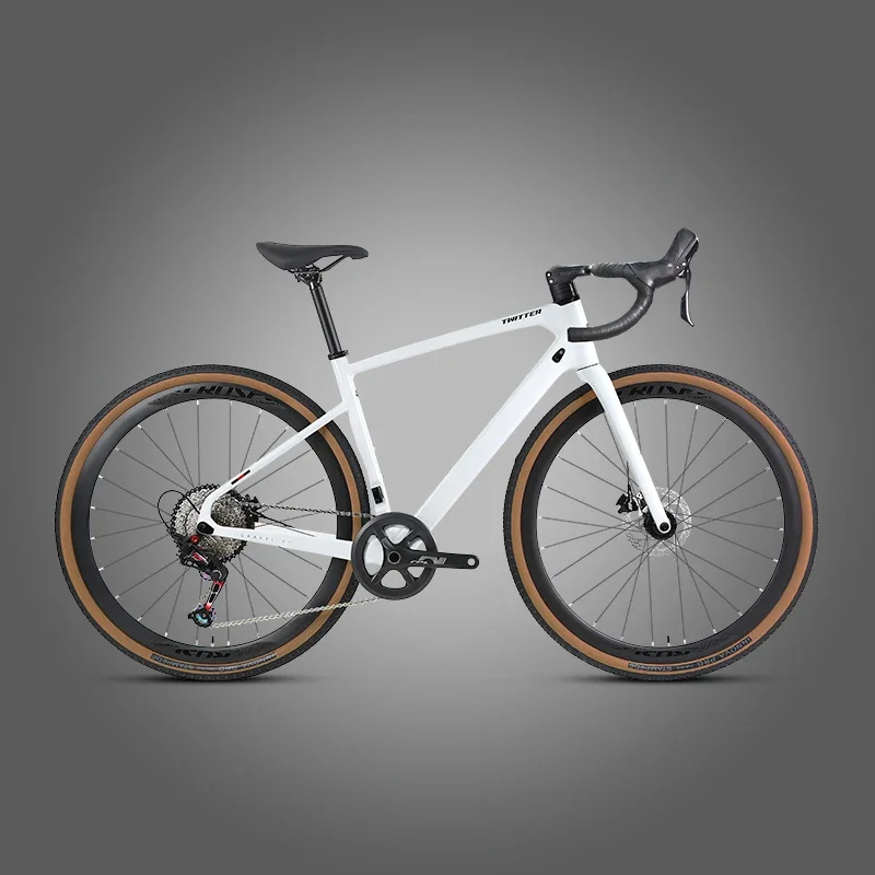 Rower szosowy gravel TWITTER GRAVEL-V3 z kierownicą typu flat bar, radiem EDS, 13-rzędową transmisją, w pełni karbonową konstrukcją i hydraulicznymi hamulcami tarczowymi.