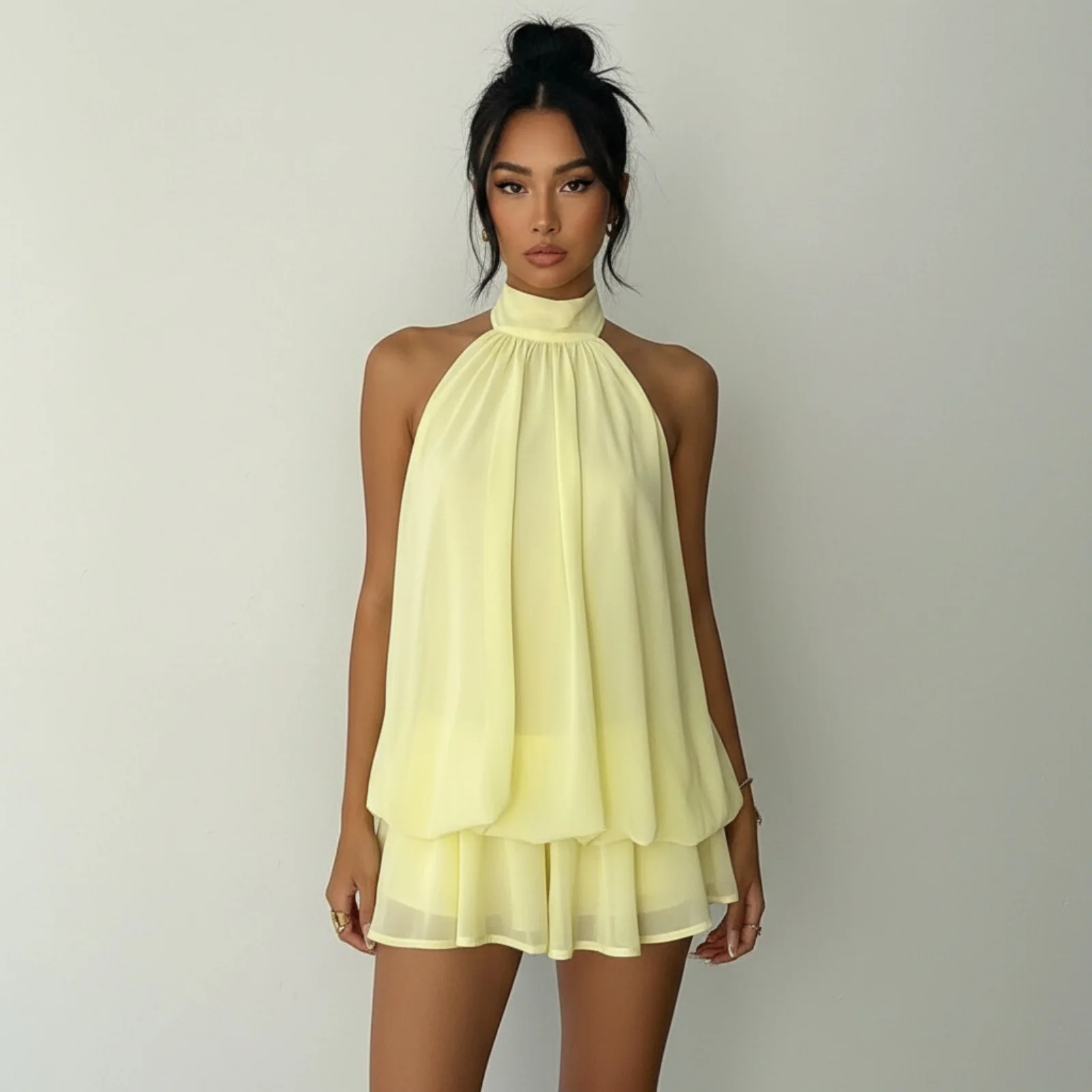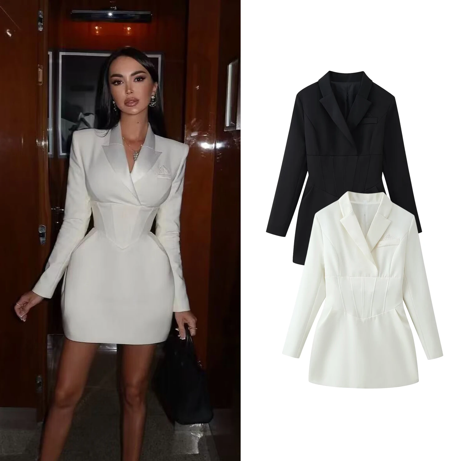 Nowa Wiosenno-Letnia Damska Seksowna Sukienka w Stylu Pure Desire Bez Ramiączek z Jednym Dekoltem, Plisowana, Jednolita, Dopasowana, Luźna, z Długim Rękawem