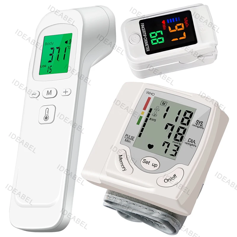 Cyfrowy termometr na podczerwień do pomiaru temperatury na czole i w organizmie, bezdotykowy termometr do pomiaru gorączki lub medyczny przenośny pulsoksymetr do pomiaru saturacji krwi tlenem.