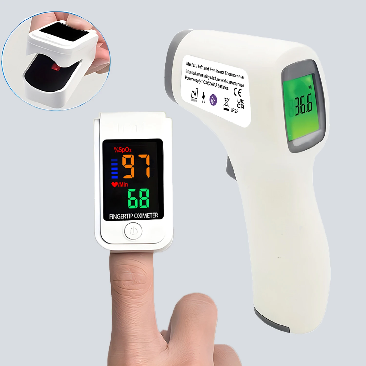 Cyfrowy termometr na podczerwień do pomiaru temperatury na czole i w organizmie, bezdotykowy termometr do pomiaru gorączki lub medyczny przenośny pulsoksymetr do pomiaru saturacji krwi tlenem.