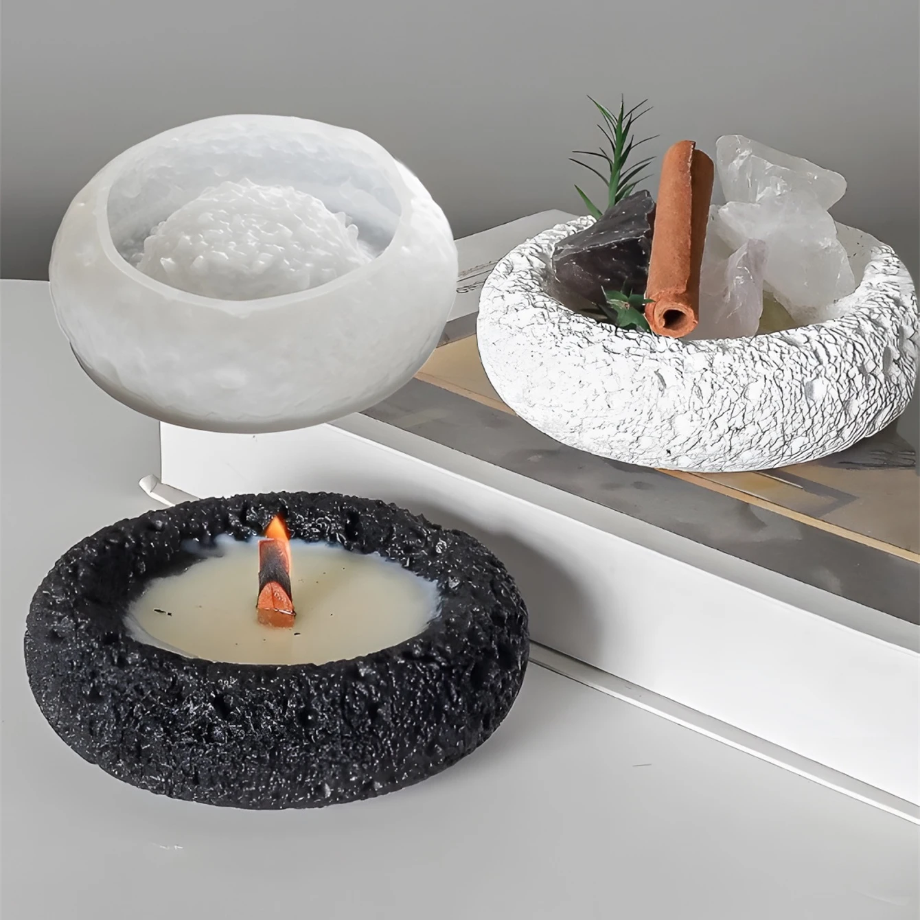 Forma silikonowa do odlewania z żywicy, gipsu, gliny, do samodzielnego wykonania okrągłego pojemnika na kamienie kosmiczne, popielniczki, z teksturą kamienia, na świeczki aromaterapeutyczne.