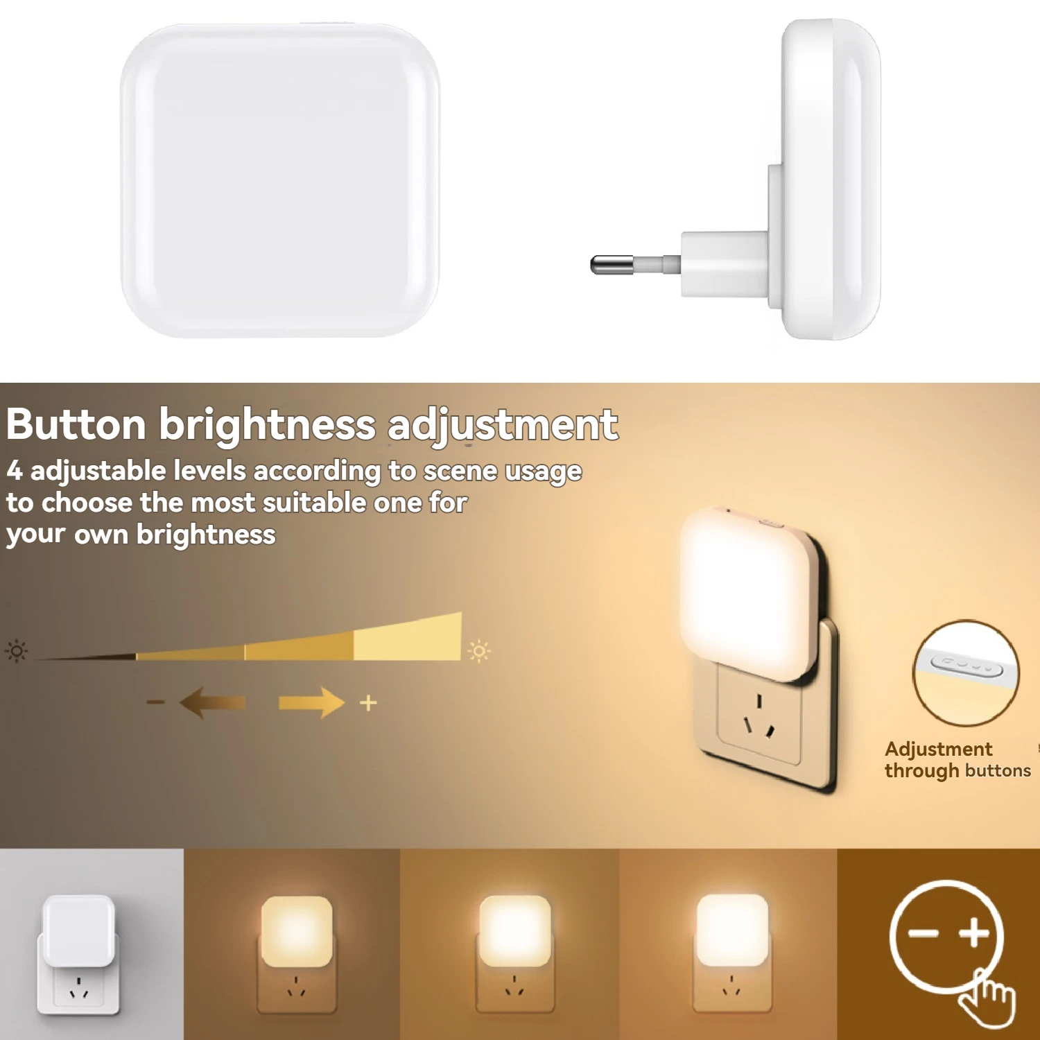 Ściemnialna lampka nocna z czujnikiem automatycznego włączania/wyłączania, zasilana przez gniazdko, ciepłe światło, energooszczędna, wąska konstrukcja, do sypialni, łazienek, na schody, do przedpokojów.