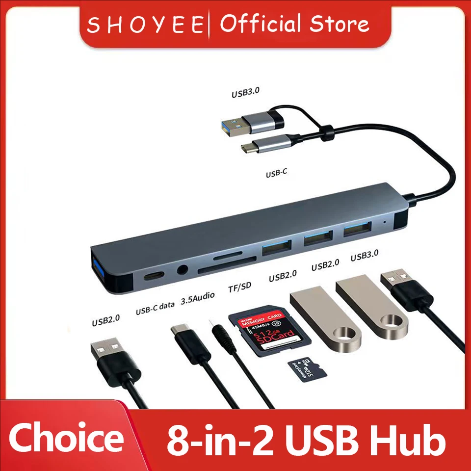 Hub USB 8 w 2 z rozdzielaczem, czytnikiem kart, portem USB C, USB 3.0 / 2.0, czytnikiem kart SD/TF, stacja dokująca