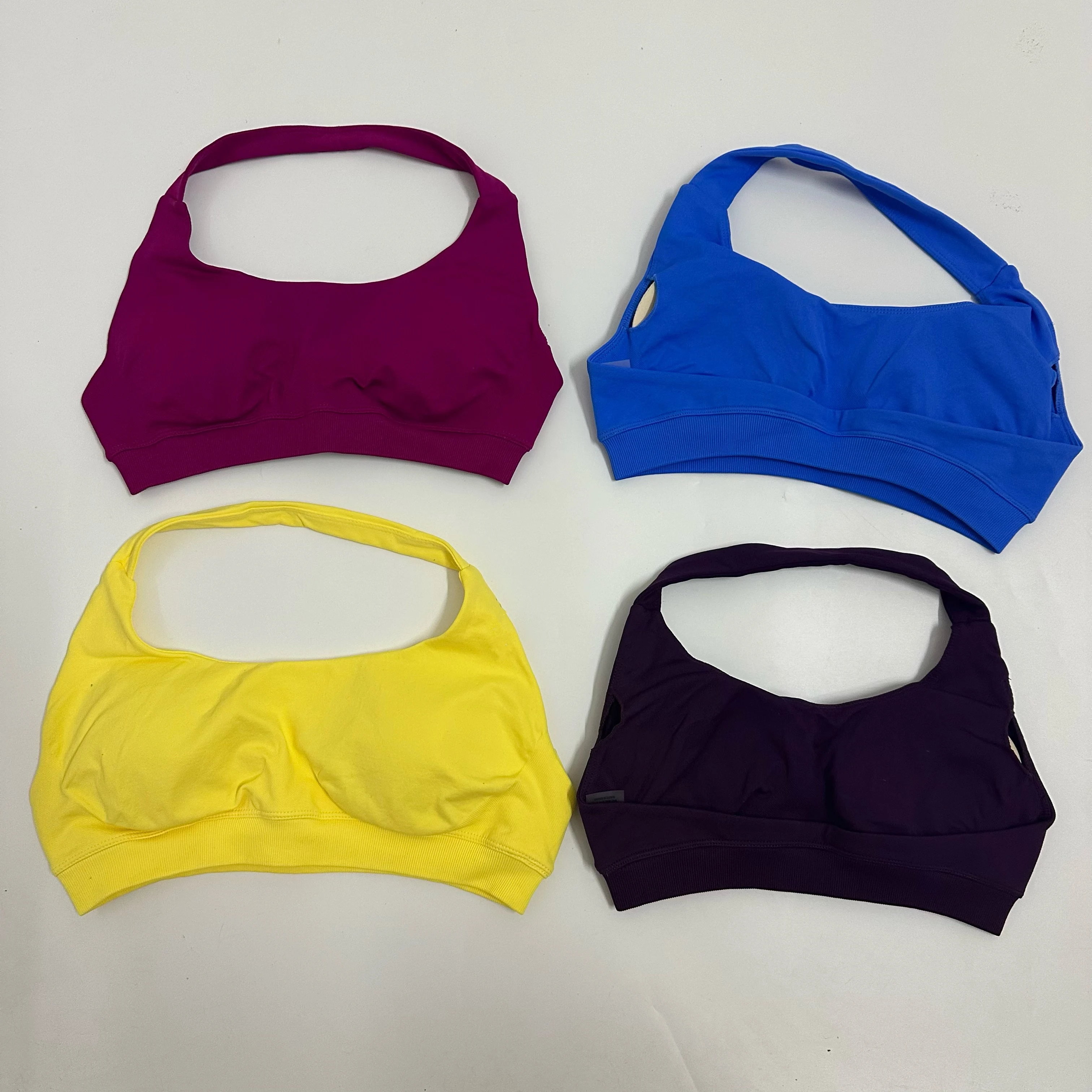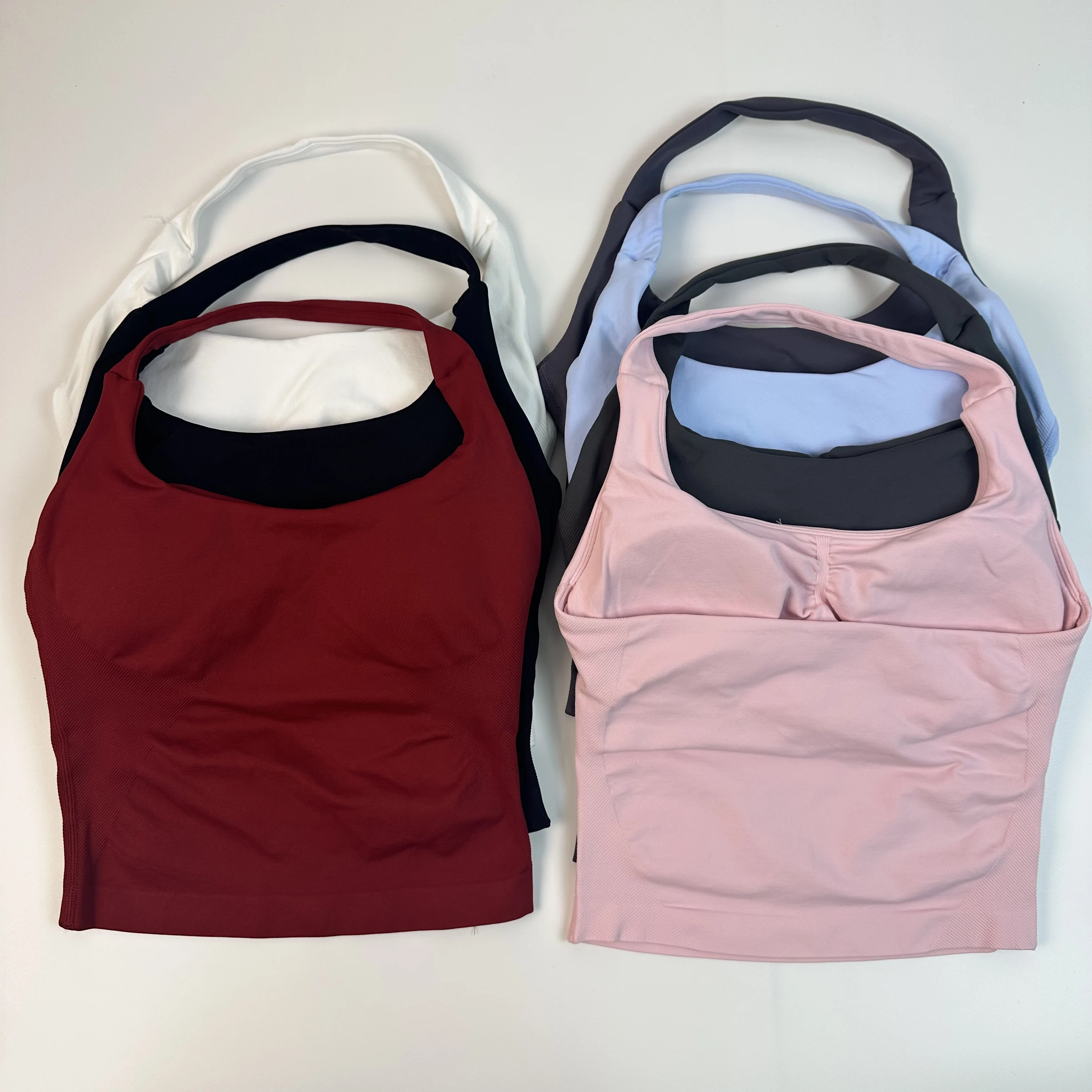 Top sportowy damski bez logo, 18 kolorów, do jogi online, na ramiączkach, bez pleców, odzież gimnastyczna, marszczony biustonosz wbudowany z wyjmowanymi wkładkami, topy do jogi.