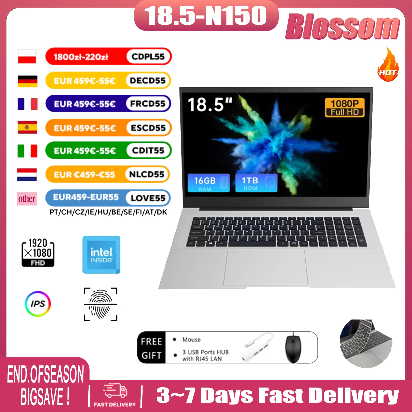 Bossom N150 Laptop 16GB RAM GB/1TB SSD Intel Notebook Komputer lekki, jasne tło, czytnik linii papilarnych, Windows 11