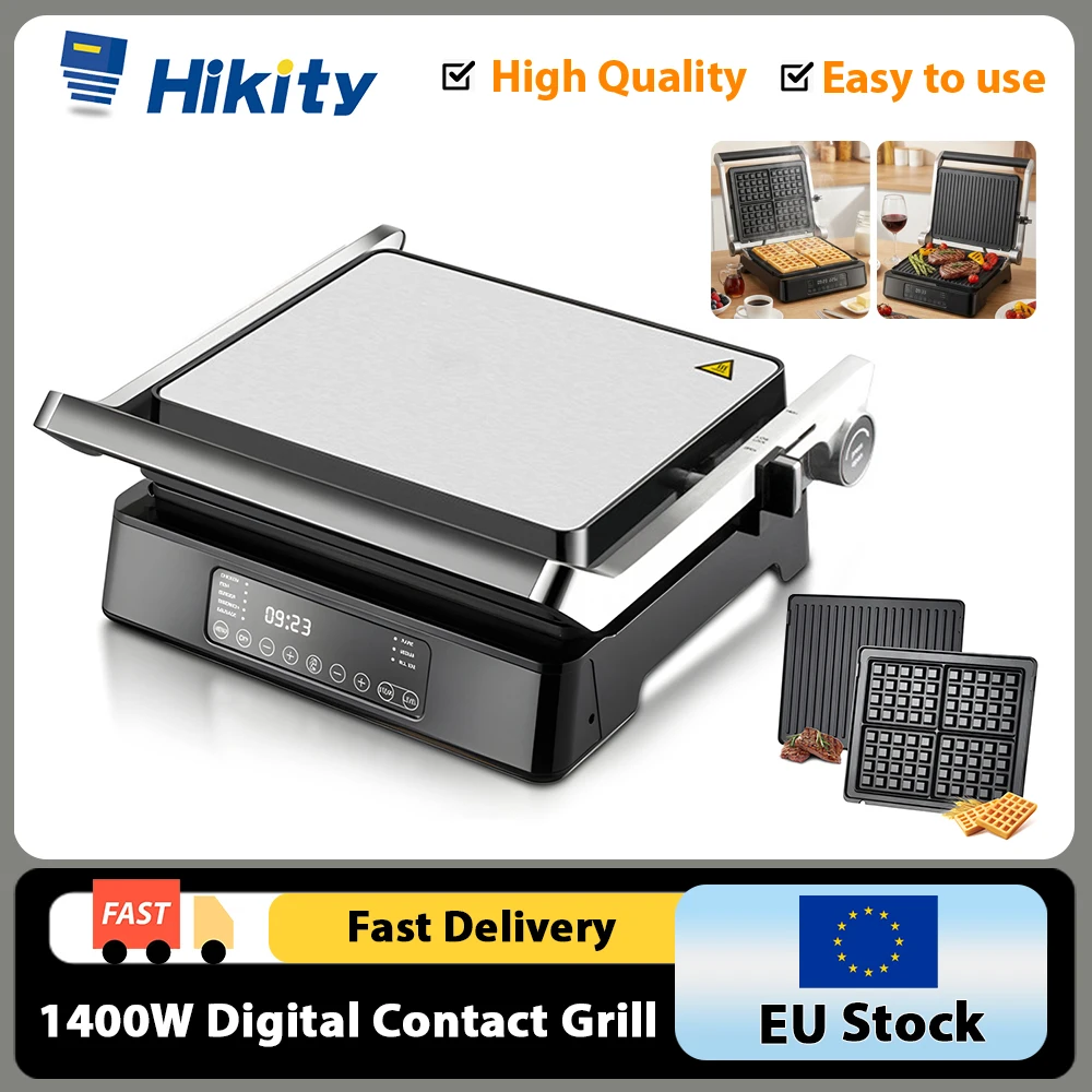 Grelhador Elétrico Hikity 1400W Multifuncional com Chapa Antiaderente e Placas Intercambiáveis para Cozinha Doméstica, Café da Manhã e Jantar