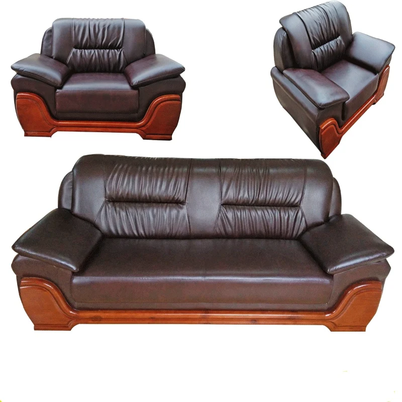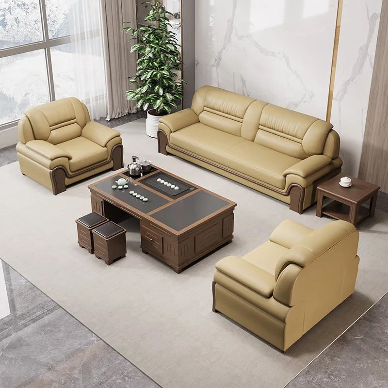 Sofá de escritório de couro genuíno de três lugares de alta qualidade com mesa de centro Móveis de recepção de negócios chineses para sala de estar
