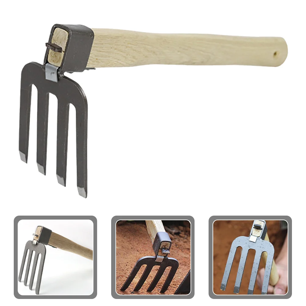 Ancinho de jardim com cabo de madeira, aço resistente, pequeno, portátil, ferramenta de jardinagem, ergonômico, ancinho de mão para capina, cultivador de aeração do solo