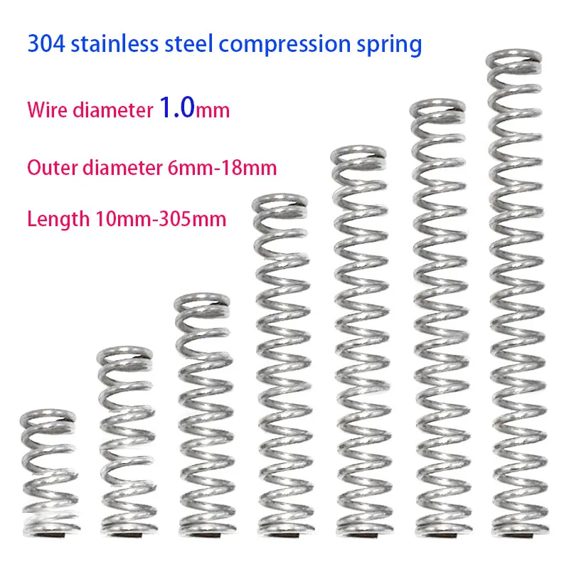 Mola de Compressão em Aço Inoxidável 304 com Diâmetro do Fio de 1.0mm, Diâmetro Externo de 6/7/8/9/10/11/12/13/14/15/16/18mm, Comprimento de 10mm-305mm