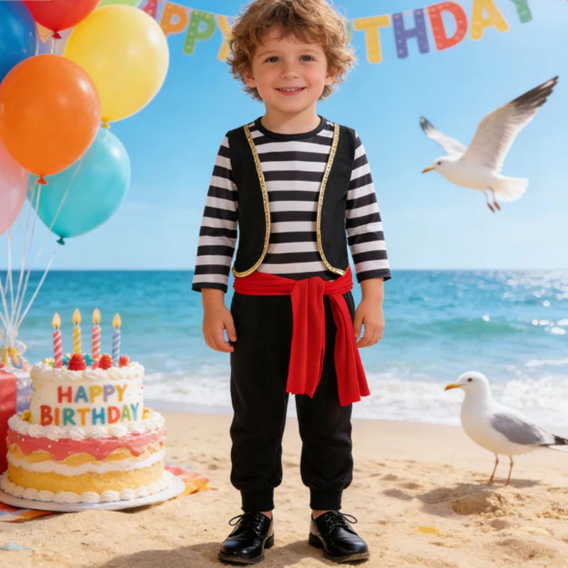 2026 traje de carnaval menino capitão define traje pirata para crianças listrado manga longa topo + calça terno com olho remendo chapéu pirata conjunto