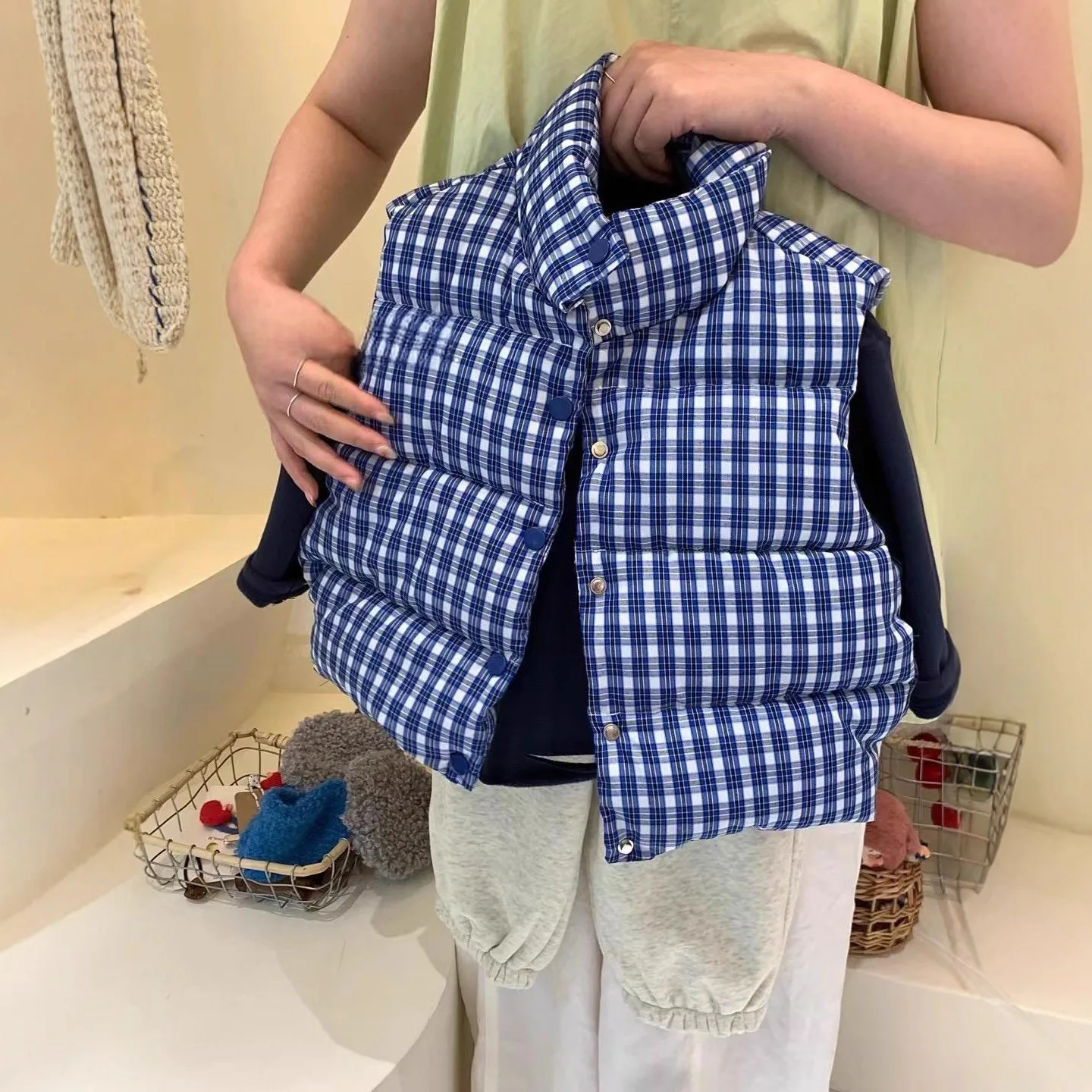 Casaco calças crianças azul xadrez algodão colete meninas roupas de inverno novas roupas do bebê retro estilo ocidental quente versátil na moda
