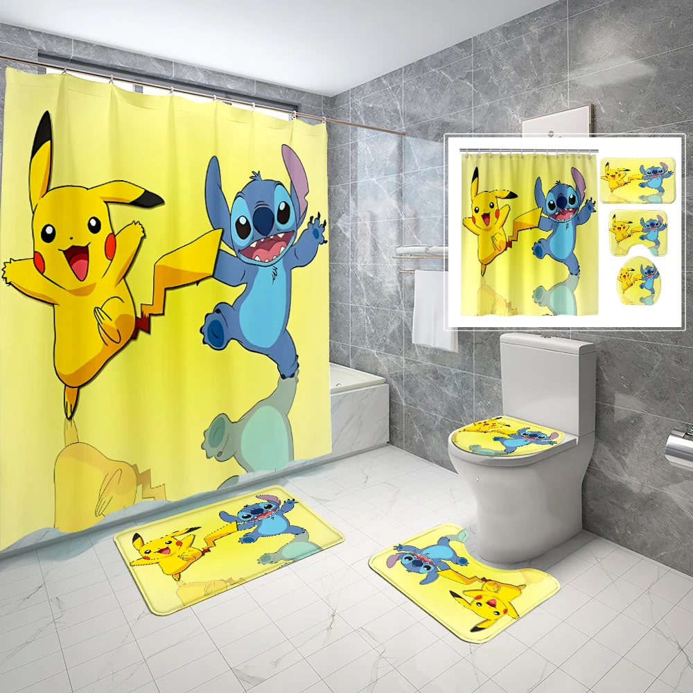 1/4 pçs pikachu padrão conjunto de cortina de chuveiro cortina de chuveiro com 6/12 ganchos antiderrapante tapete de banho em forma de u tampa do vaso sanitário coverpad