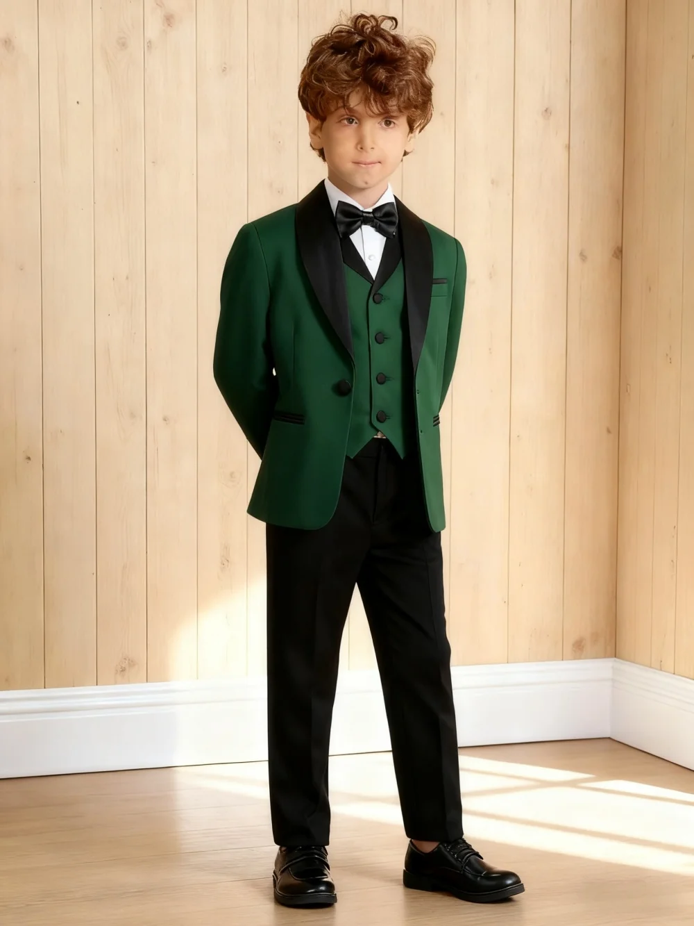 Venda quente elegante verde esmeralda meninos terno formal conjunto 3-14 anos 4 peças crianças casamento smoking blazer colete calças gravata borboleta
