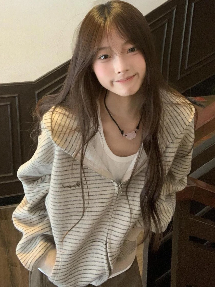 Casaco Cardigã Feminino com Capuz Estilo Americano, Listrado em Blocos de Cores, Solto, Estilo Descontraído, Outono, com Zípe...