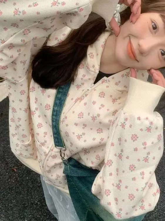 Jaqueta com Capuz Estampada Floral para Primavera e Outono, Estilo Casual Versátil para Mulheres, Design Despojado, Manga Lon...