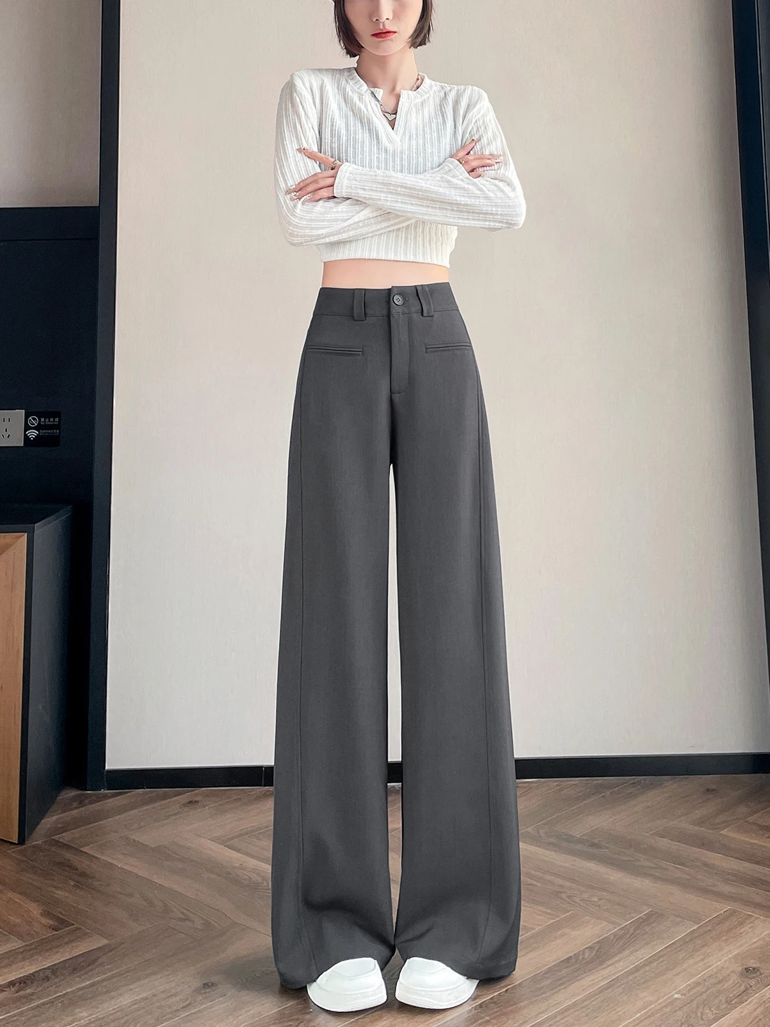 Calças de Terno Cinza Fenas Casuais Largas de Cintura Alta com Pernas Largas Estilo Novo para Primavera, Outono e Inverno