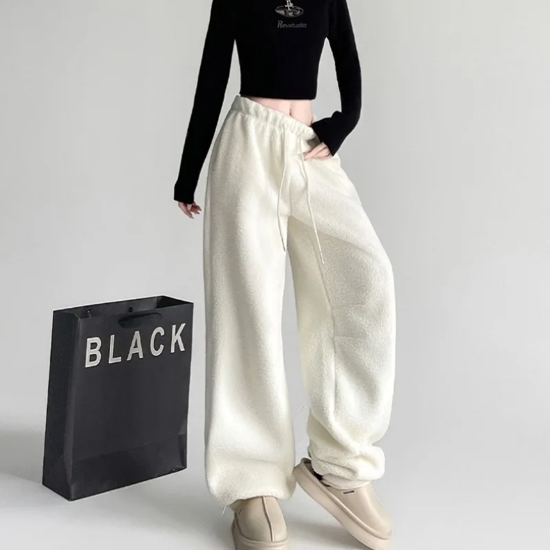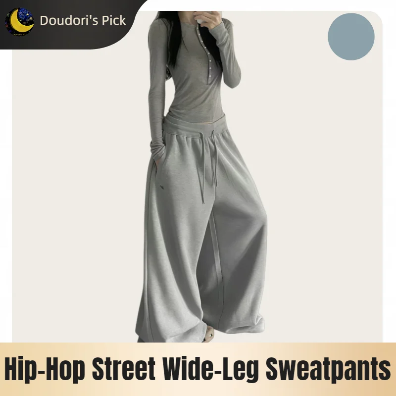 Coreano hip-hop estilo de rua feminino cinza dupla camada composto não-velo tecido elástico na cintura design cordão hem solto calças de moletom de perna larga