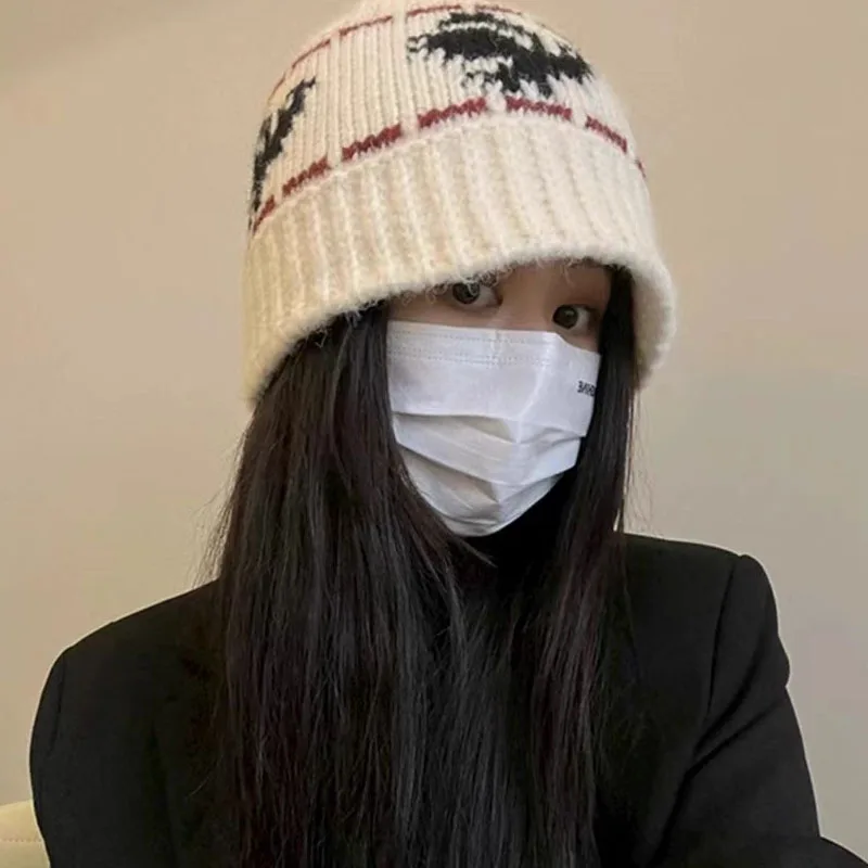 Bege preto paz pombo malha balde chapéu feminino outono inverno retro jacquard quente elástico boné menina ao ar livre pescador chapéus