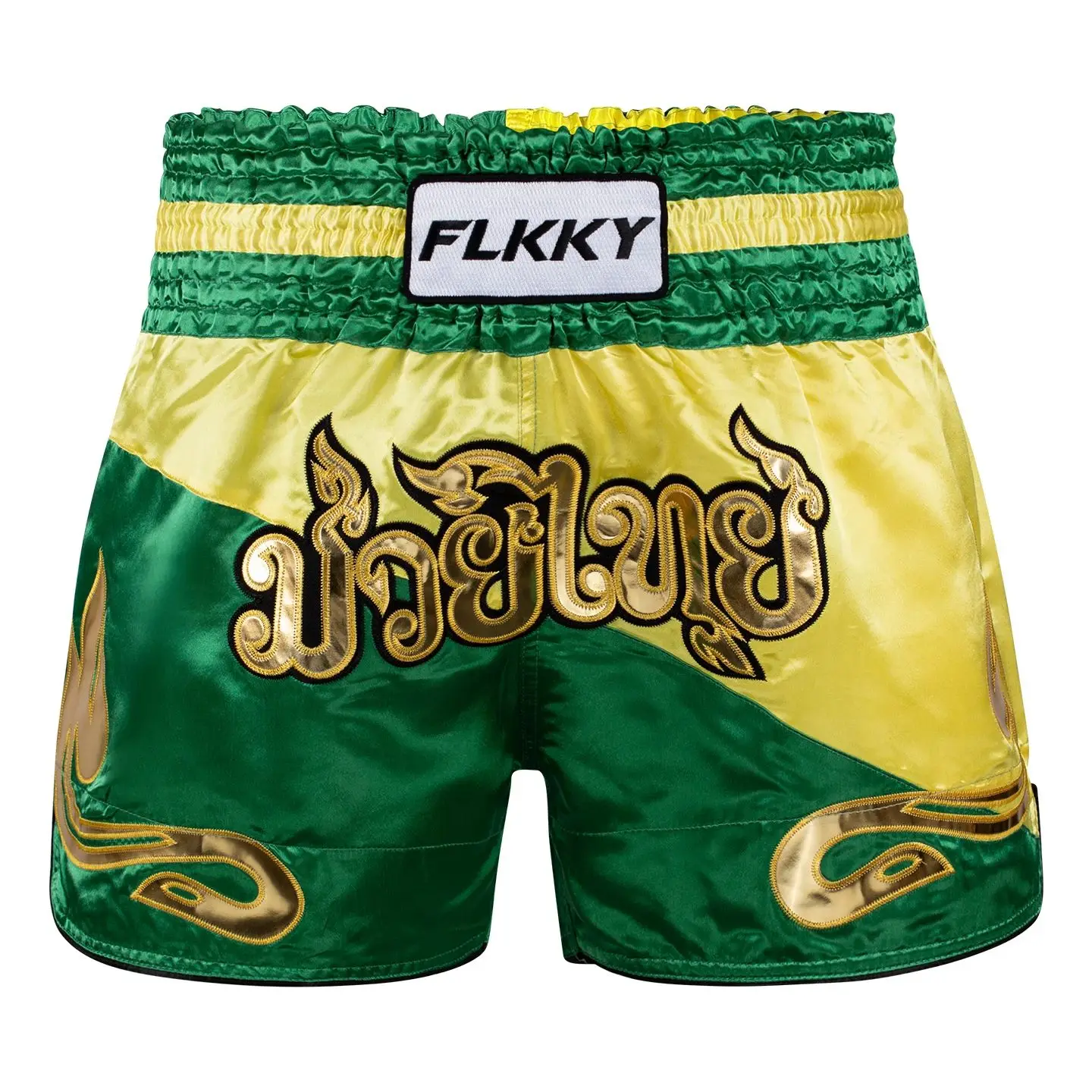FLKKY Shorts Muay Thai com contraste bordado para crianças e adultos, shorts clássicos de Muay Thai para academia, shorts de boxe