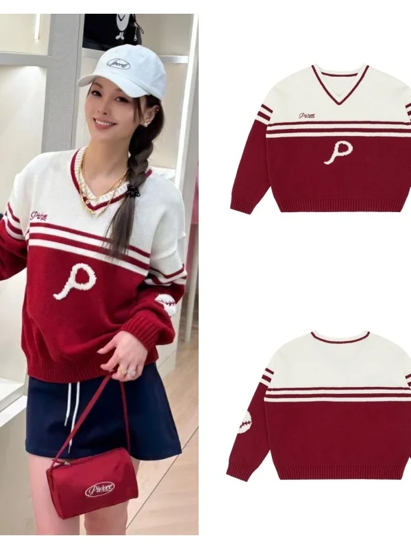 Outono inverno novas roupas de golfe feminino longo sve malha solta spor faionable versão coreana v-ne casaco superior
