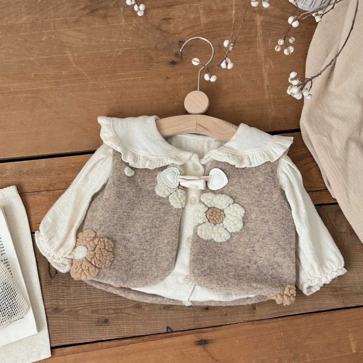 Meninas bebê colete inverno nova moda flor bordado com decote em v uma fivela de chifre de vaca crianças bonito simples versátil coletes