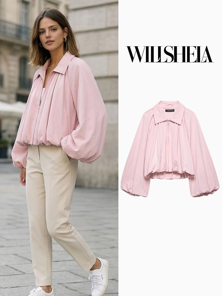 Jaquetas Bomber Plissadas Rosa com Zíper Frontal para Mulheres Willshela, Estilo Vintage com Gola Lapela e Mangas Longas, Roupas Elegantes Femininas