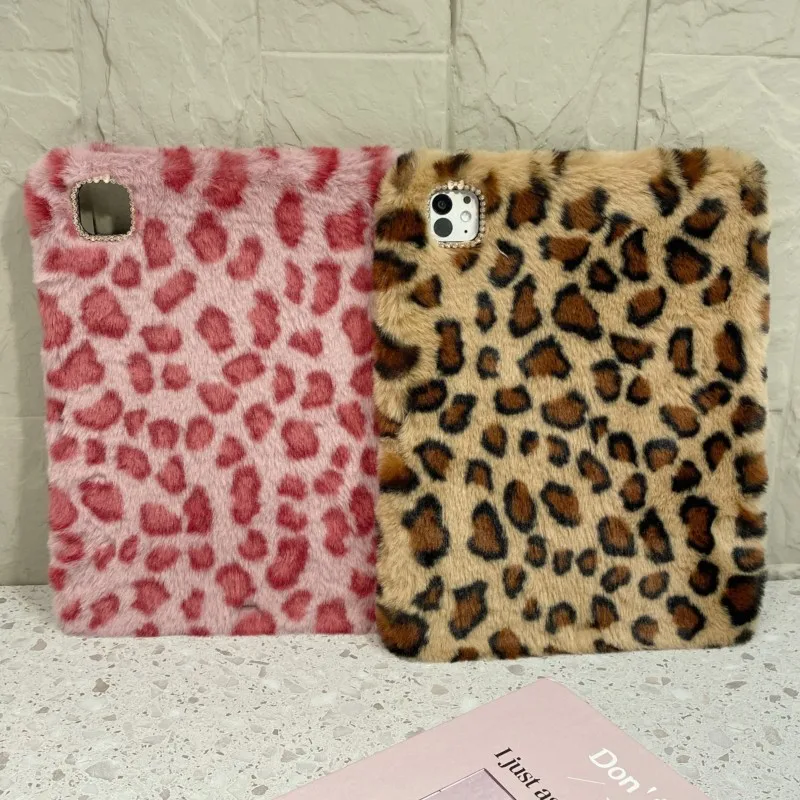 Capa de Tablet Antichoque de Pelúcia Rosa/Marrom com Estampa de Leopardo e Compartimento para Lápis para iPad 7-9ª Geração 10.2in, Air3 10.5in, Air4/5 10.9in, 10ª Geração