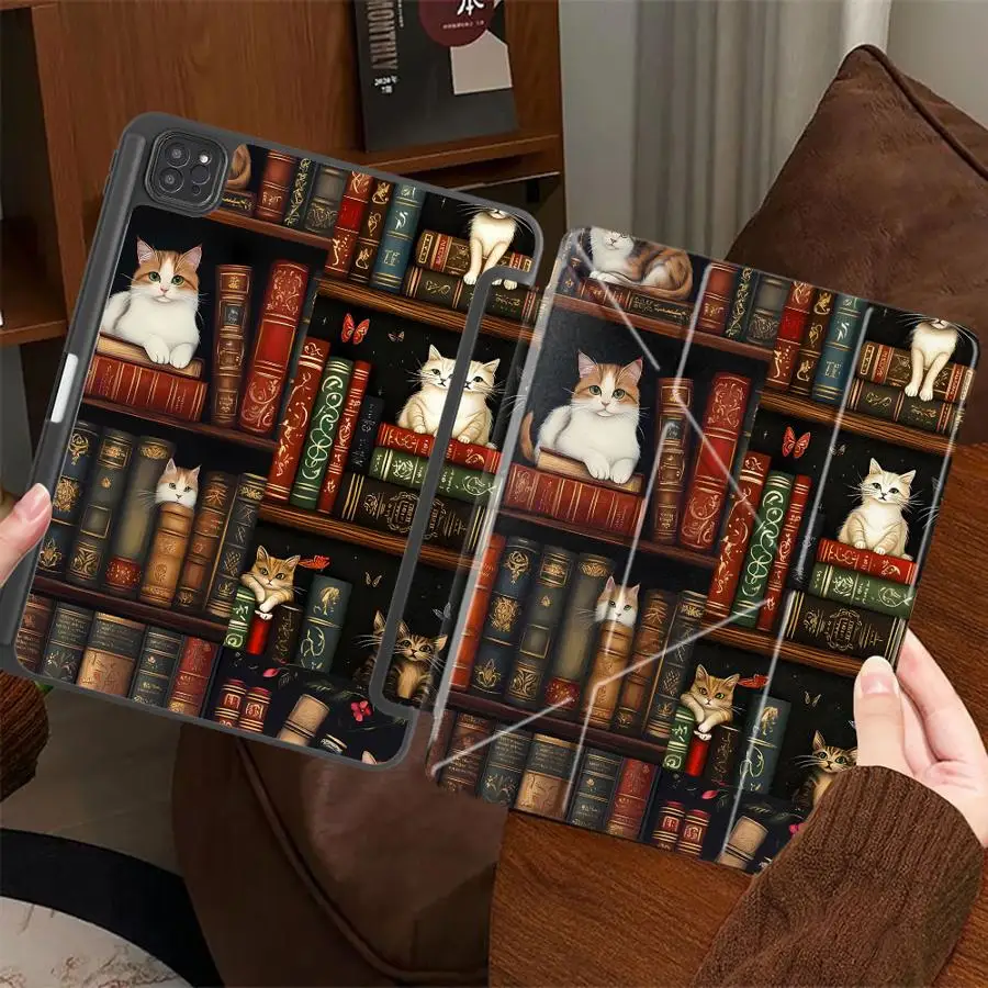 Capa de Tablet com Suporte de Gato para Estante de Livros de Desenho Animado para iPad Air 4 5 M3 M2 M4 11 polegadas Mini 6 7 Pro 11ª 10ª 9ª 8ª 7ª 12.9 polegadas Pro