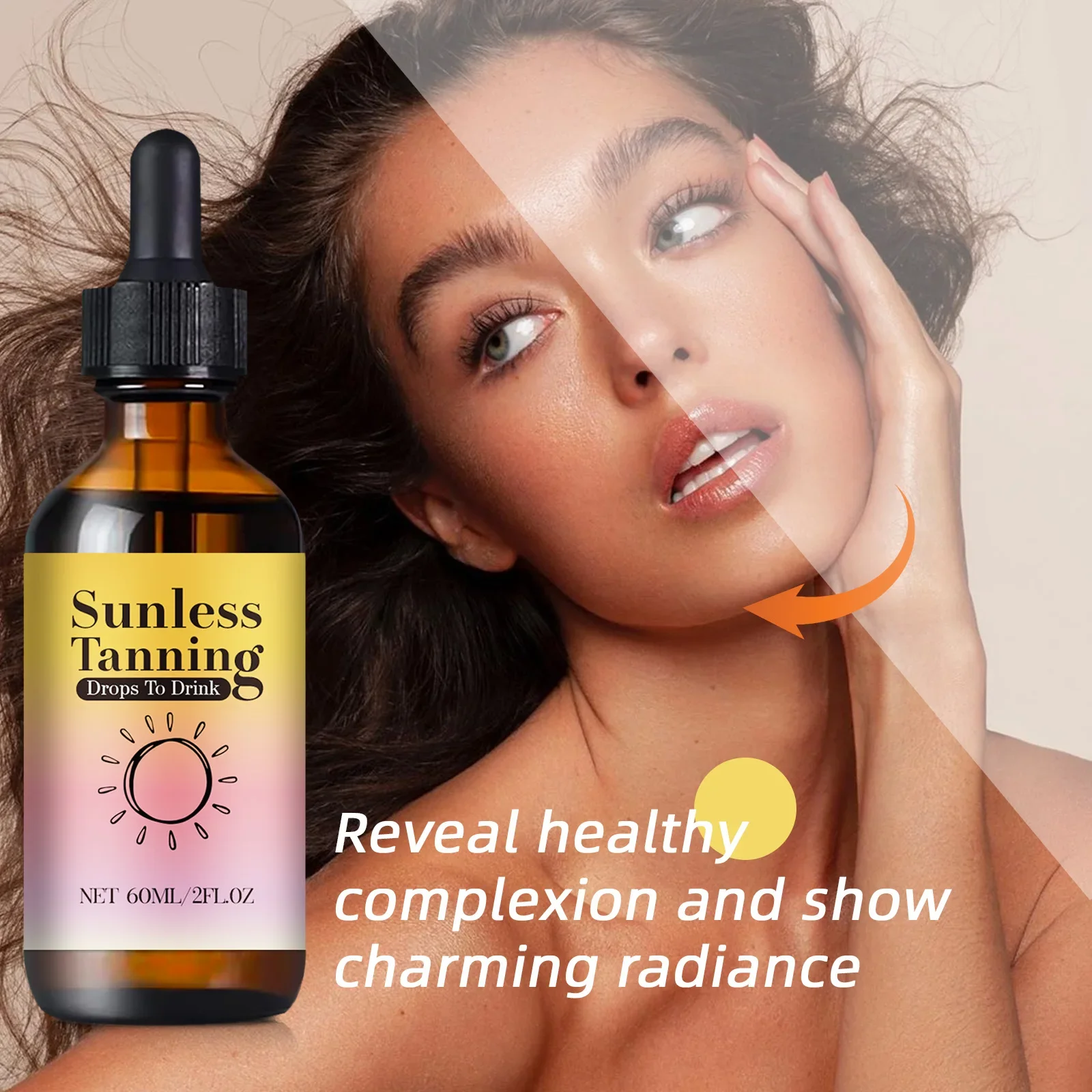 Gotas autobronzeadoras que aumentam a melanina. Um bronzer líquido bronzeado de aparência natural para rosto e corpo. Proteja o brilho beijado do sol da sua pele