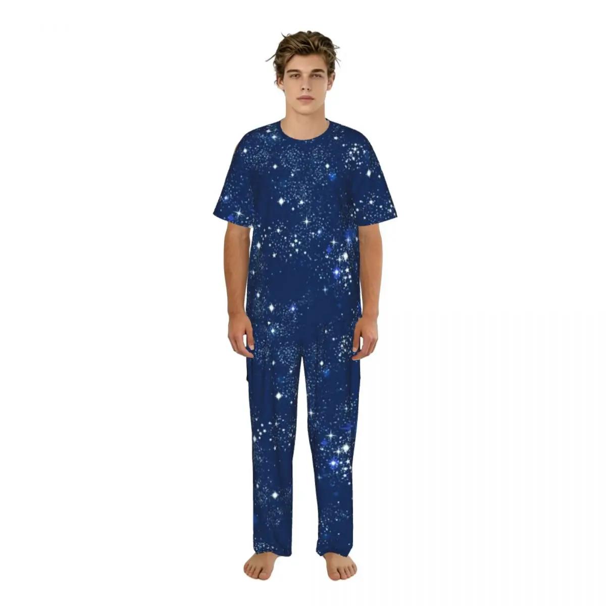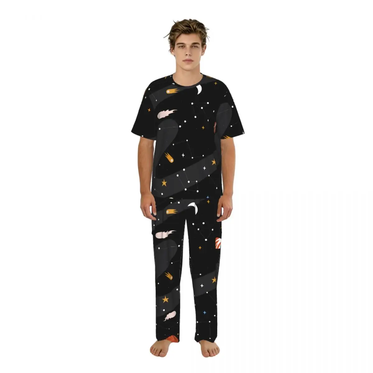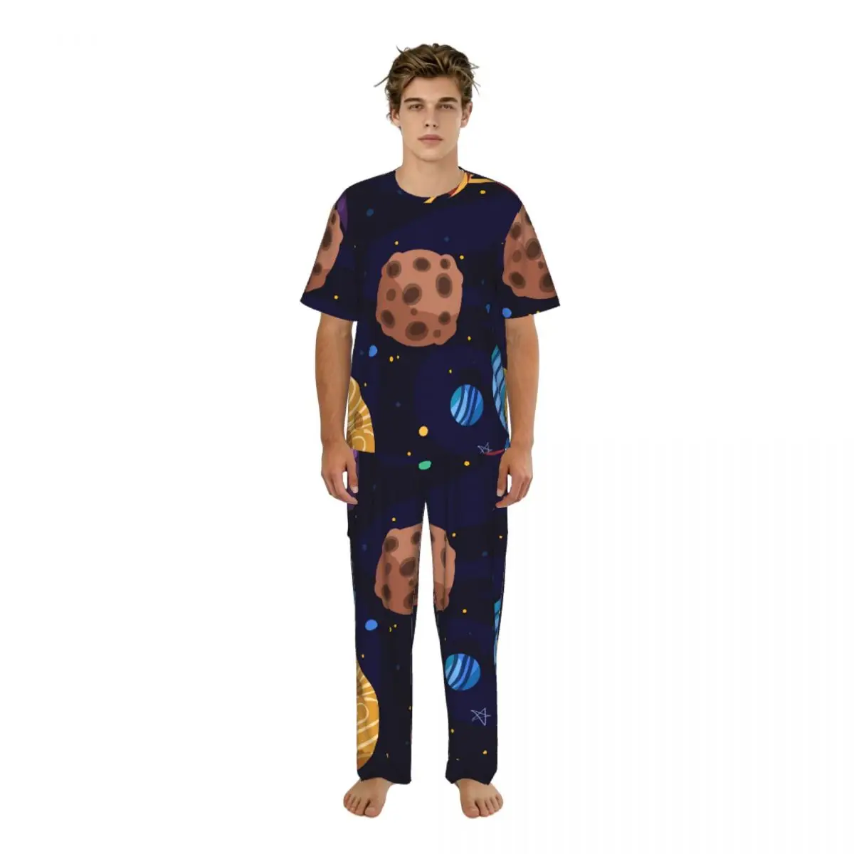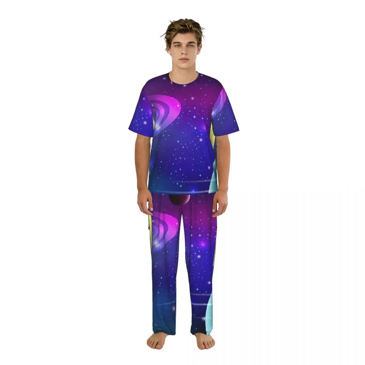 Conjunto de pijamas masculinos de verão, camisetas de manga curta + calças compridas, roupa de dormir para casa, pijamas coloridos com estampa de galáxia