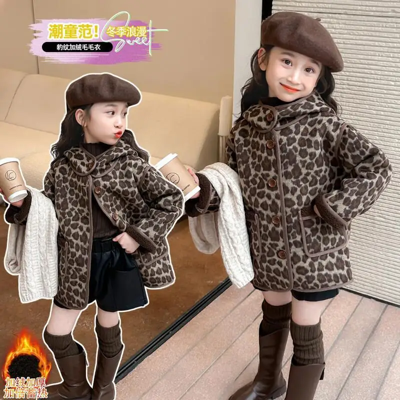 Outono inverno meninas casaco quente leopardo impressão topos jaqueta com capuz nova moda confortável crianças roupas estilo retro uso diário