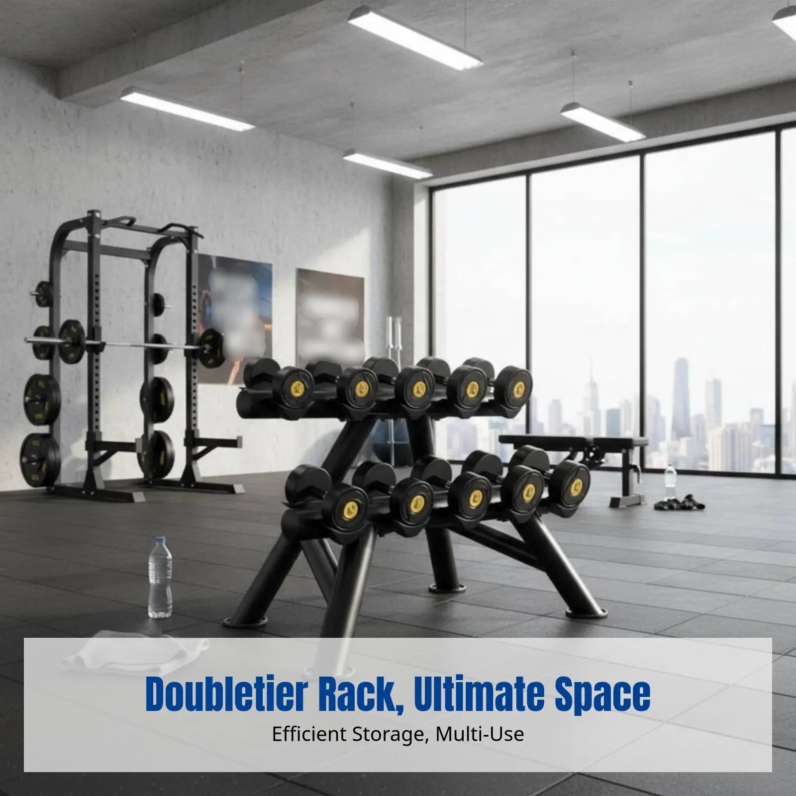 Suporte para Halteres, Aço Carbono Reforçado Comercial, Armazenamento para Academia Doméstica, Inspirado nos EUA, Design Vertical de Dois Níveis