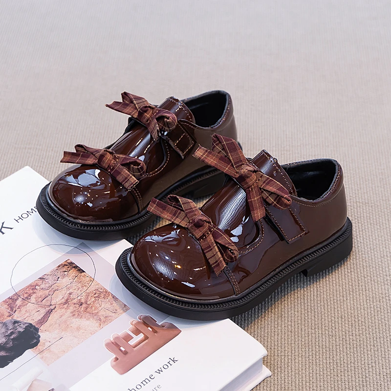 Mais novo primavera outono bebê meninas moda couro patente grande arco princesa mary janes sapatos de festa cor sólida estudante sapatos planos