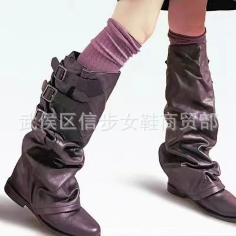 Botas Femininas Estilo Britânico com Fivela, Salto Baixo de 3CM, Moda Casual, Tamanho Grande 46, Botas de Trabalho, Botas Retrô Plissadas de Cano Médio