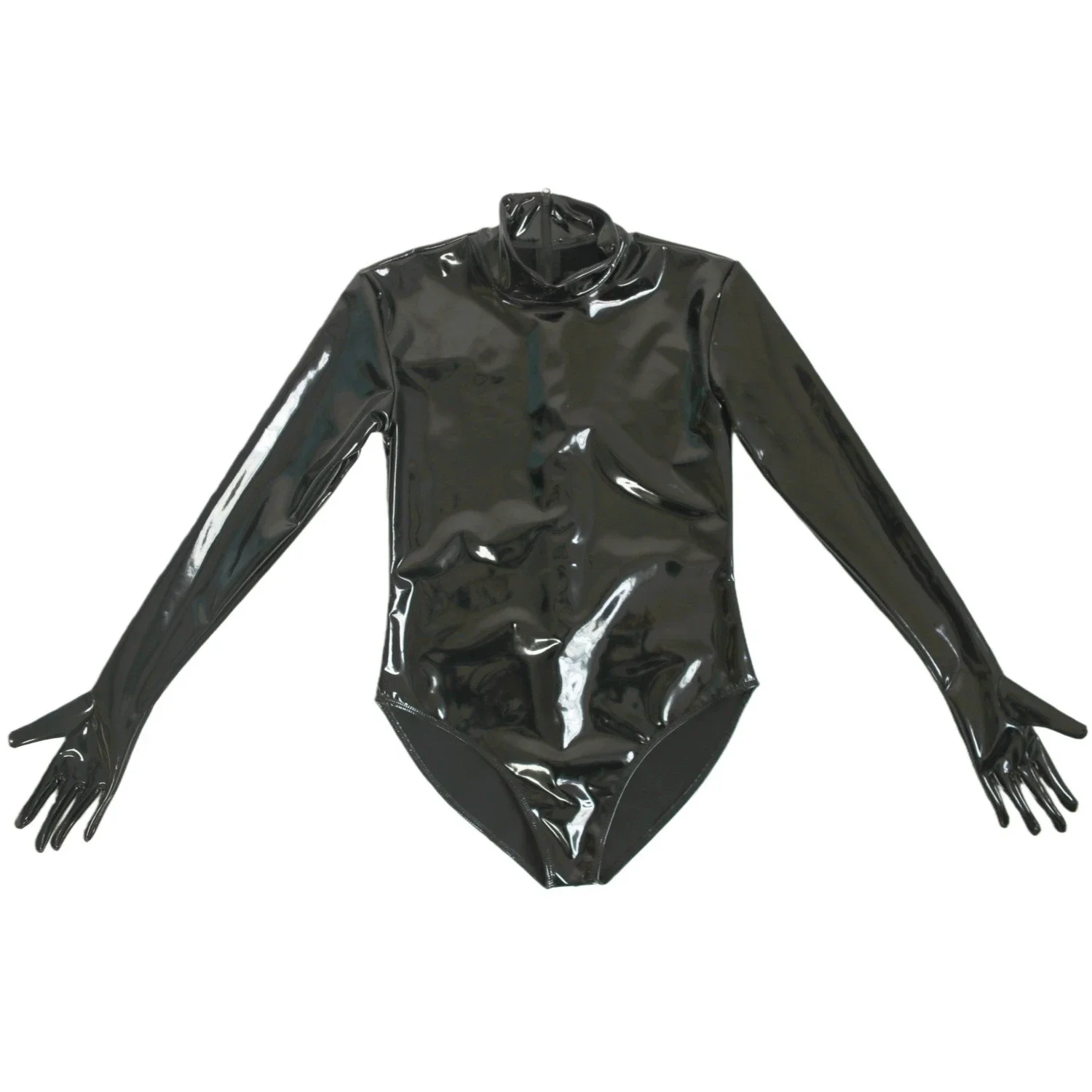 Moda feminina couro do plutônio bodysuit luva manga estilo elástico látex amônia tecido sexy casa couro collant empregada wear 5xl