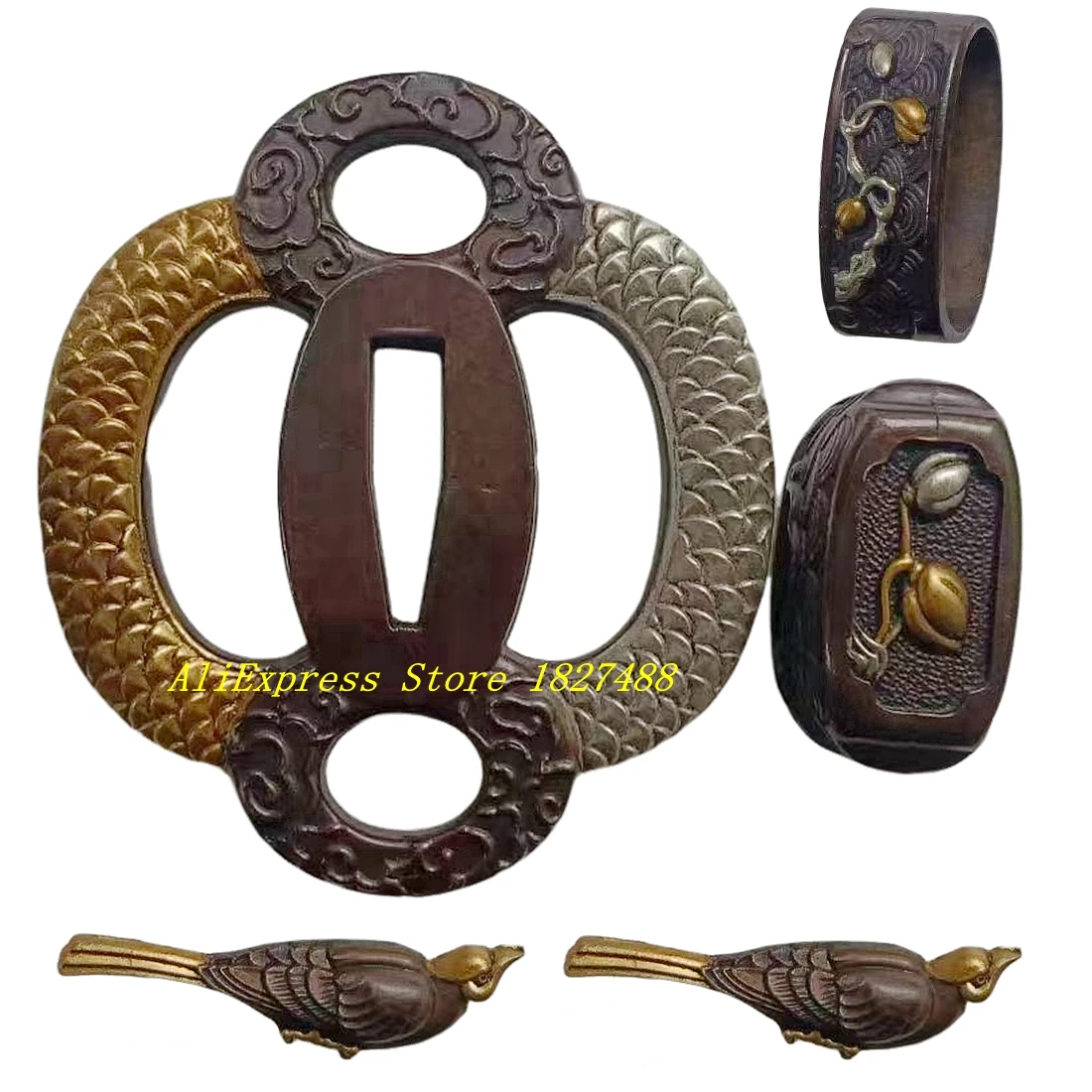 Um conjunto de cobre tsuba guad menuki fuchi kashira para katana wakizashi tanto espada japonesa handguad personalizado diy acessórios de metal